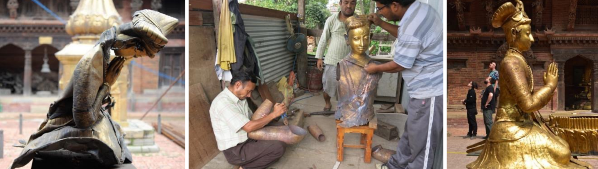 Fig. 14: Left: Except the face of the statue, every part was badly crushed. Photographs: University of Applied Arts. August 2015. Middle: Metal craftsmen (repousse) repairing damaged parts. Right: King’s statue after restoration and gilding. Photographs: Rohit Ranjitkar. October 2016 and February, 2017.