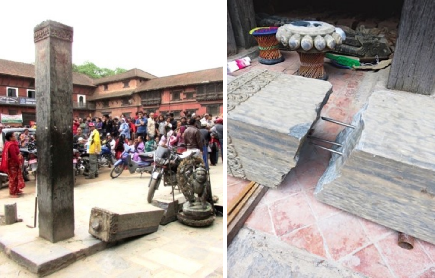 Fig. 18: Left: The Bhimsen Lion Pillar collapsed in the earthquake. Photograph: Suresh Lakhe. April 25, 2015. Right: Broken pieces were repaired using stainless steel pins to join both elements. Photograph: KVPT. Aug. 2015.