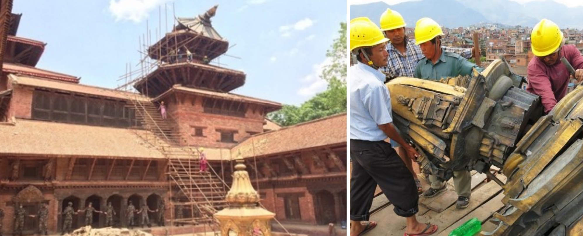 Fig. 8: Left: The North Taleju top tier was dislodged from its respective place, which appeared to be in critical condition. If it were to come down, it would certainly create more damage to the lower sections of the roofs. Scaffolding was started within a week of the earthquake, and the top tier was secured to prevent further damage to lower roofs. Soldiers are seen at the bottom transferring rescued bricks from the square to the back garden. Right: Metal craftsmen disassembling the pinnacle as an emergency rescue. Photographs: Rohit Ranjitkar. May 10, 2015.