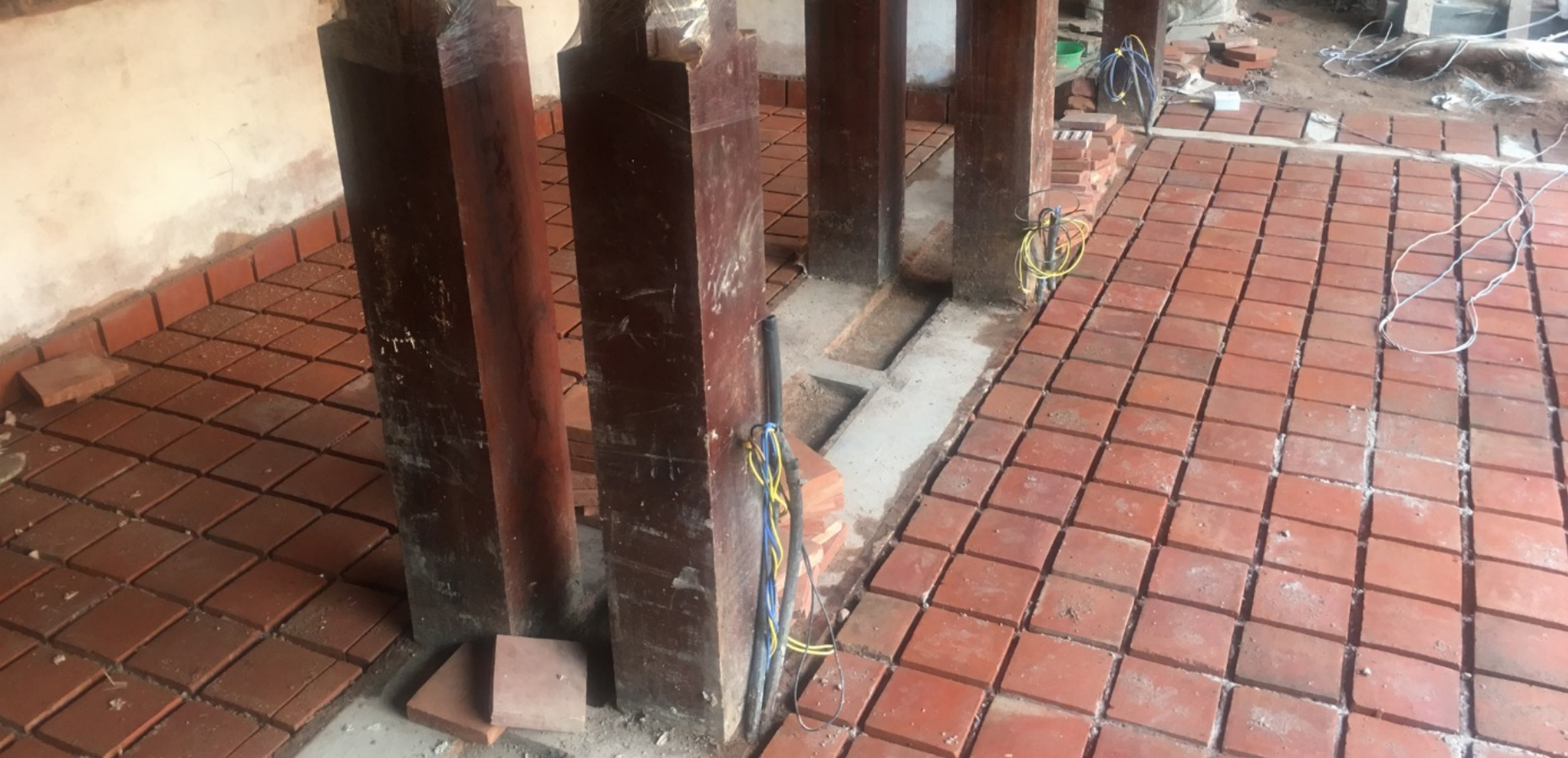In traditional construction, ilvahaṁ is meant to bear vertical upright columns. An approximately 1.5" high sloping crown/apex on the ilvahaṁ (see Fig. 8), which acts as the base of the upright column, slightly raises the base of the column from the ground level so that any moisture on the ground would not easily find its way to the base of the column thus preventing the case of wet rot. But the proposed detail in Guitabahī with the base of the column right at the ground level would let the moisture into the base easily, thus creating a favorable environment for wet rot (Fig. 7 & 9). The technical team involved might have been misinformed and misled about the floor tiles being waterproof (actually, they are not). This might have led them to think of lining the base runner with floor tiles to prevent cases of wet rot. This was a totally wrong idea from the very outset. The complaint on the issue of possible damage to the wooden member underneath the was also issued by the community in writing, which was rejected outrightly by the designer, stating that it is not possible to implement.