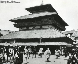 Fig. 1: Kāṣṭhamaṇḍap after reconstruction in 2021 (top) Photo: Author; Kāṣṭhamaṇḍap in 1952 A.D. (bottom) Photo: Johannes Bormmann
