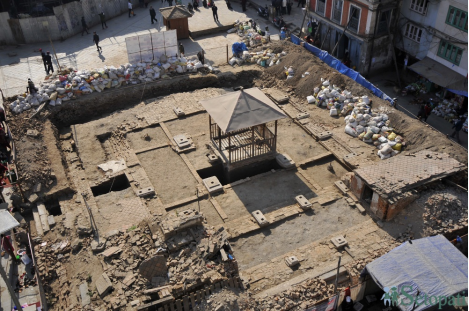 Fig. 2: Foundation of Kāṣṭhamaṇḍap revealed in the post-earthquake archaeological investigation carried out by DoA/Durham University. Photo: Narayan Maharjan (Setopati)