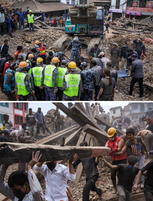 Fig. 3: The initial picture after the collapse (above); the immediate clearing operation after the earthquake. Photo: Maciej Dakowicz