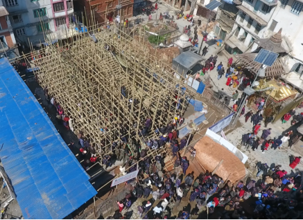 Fig. 4: The dense maze of bamboo scaffold was put up to aid the hoisting of the posts (top left) Photo: KRC; The post being positioned before hoisting (top right) Photo: Sugat Tamrakar; The post being carried to the site (bottom left) Photo: Social Media; The hoisting of the posts using traditional method (bottom left) Photo: Sugat Tamrakar