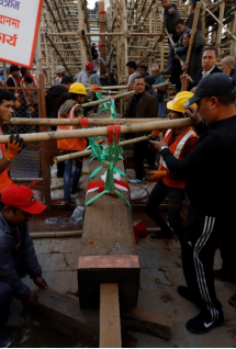 Hoisting four main posts in place was thought to be the most challenging task of all. However, it was successfully carried out in the midst of a ceremonial event. Without any prior knowledge of how it was hoisted in the past, every possible way that could result in safer and quicker hoisting was discussed. Modern means like cranes and pulleys were also proposed, and quotations were called. But in the end, it was decided that no means other than by using non-modern and non-mechanical ways and by involving the community in the process will somehow enact the way it was hoisted in the past and will respect the tradition at the same time. The master carpenter and his team devised their own mechanism and everything was set up accordingly. A dense maze of bamboo scaffold was pulled up within a week or so, ropes were set in place and the community volunteers eagerly stood ready for the posts to be arrived. Transporting the posts from the workshop at Hanumandhoka from where they were being prepared at some 200 meters from the site was another mammoth task. Members of various guṭhī-s, musical troops and societies, who were invited to volunteer, carried the posts from the workshop to the site in a grand procession. Finally, the hoisting was carried out sequentially in the middle of hooting and cheering and with the jovial participation of all groups of citizens. It was believed that the event added a noble value to the reconstruction process of Kāṣṭhamaṇḍap.