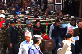 The next ritual carried out by Sā Guṭhī, associated with Ḍaṅgol community of Bhimsensthan close by, is celebrated on the 1st of Māgha every year. During this ritual, the members of guṭhī take a copper cauldron inside Kāṣṭhamaṇḍap the day before boiling a prescribed quantity of wheat, which is kept overnight inside one of the pavilion rooms (generally one on the north-west) on the ground floor. On the next day, i.e. on the 1st of Māgha, they perform an elaborate tantric ritual on the ḍabalī to the south of Kāṣṭhamaṇḍap, feed the boiled wheat to the cow, and finally the members go up to the pinnacle to raise a flag and strew down yomarī and locāmarī for the observers on the ground to find a catch if they are fortunate enough. By tradition, there is a queer practice at the end in which a member on the top asks aloud if the price of salt and that of oil has been equalized for the year. It is still not quite clear what the actual implication of this practice is. Besides its literal connotation, it can equally be viewed as a codified analogy to some other idea. Reconstruction of Kāṣṭhamaṇḍap was one thing, but there are myriad of other things associated with Kāṣṭhamaṇḍap that still require insightful research work.