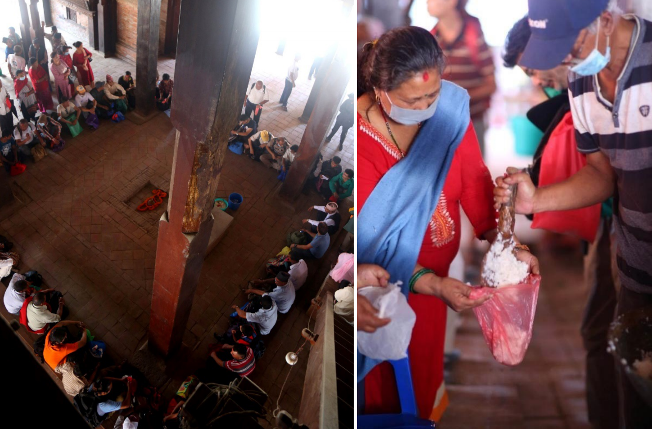 Fig. 5: After the reconstruction of Kāṣṭhamaṇḍap, people coming to receive pañjarā are made to sit around the four central posts and the khīr (rice pudding) cooked the day before is distributed. Photo: Shailesh Rajbhandari.