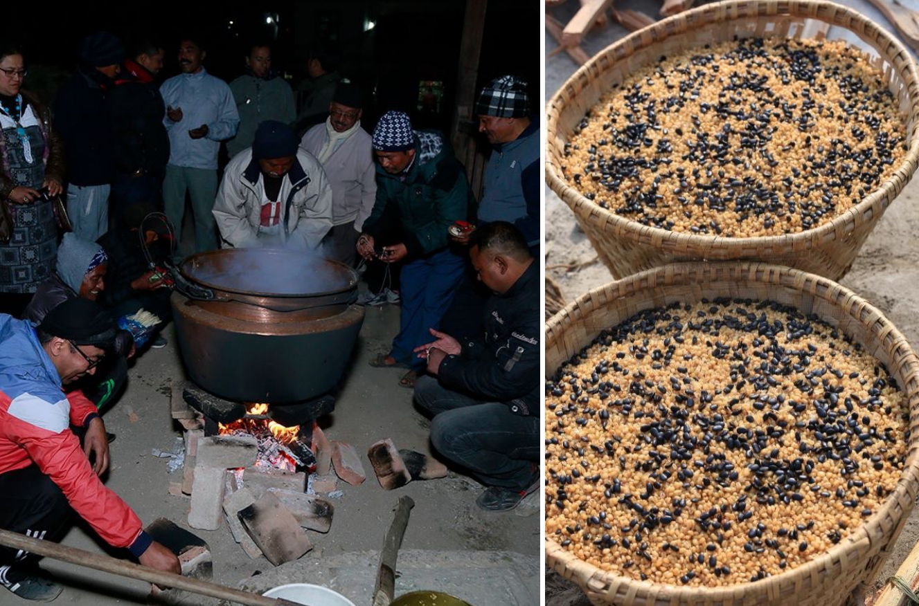 Fig. 6: The wheat is boiled inside Kāṣṭhamaṇḍap the day before and after performing elaborate ritual the next day on Māgha 1st, and it is fed to the cow. Hence the guṭhī is named as Sā Guṭhī (Sā is cow in Nevār dialect) Photo: Shailesh Rajbhandari