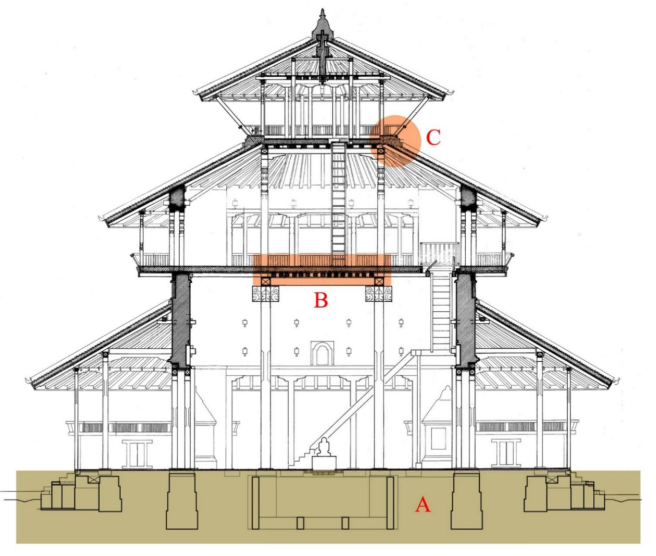 Fig . 7 : Section Drawing (after Korn:1998) of earlier version of Kāṣṭhamaṇḍap. (A) The details of foundation, which was missing earlier, were revealed from the archaeological investigation carried out by DoA/Durham University. (B) The anomalous details found in earlier drawings, e.g. the central joists have to be 10 in numbers, were corrected. (C) The details of embedded structural members, which were missing previously, were rigorously developed and implemented.