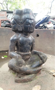 Fig. 9: The foundation of Brahma temple revealed after clearing the site (left) Photo: Binita Magaiya; The statue of Brahma (right). Photo: Author
