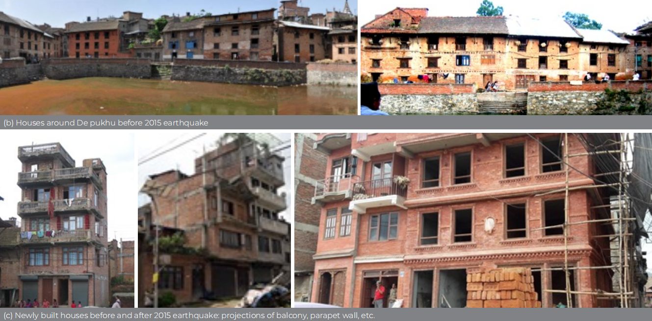 While reviewing the facade elevations of all sides, before the 2015 earthquake, the earlier unique features of facades (of row housing) had been transformed in different ways. Vertical division of old houses, thereby requiring renovation (new door and window openings with new staircases) in the divided parts, the addition of floors on the existing houses, replacing the sloped roof, plastering of brick façade, and so on, have destroyed the earlier unifying elements. The newly built houses, with higher plinth level and floor height, large horizontally oriented glass windows, and slab projection do not match the existing adjacent buildings in many ways.