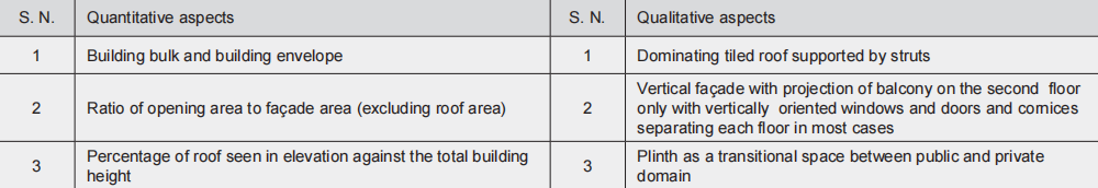 The important architectural elements identified in the past were vertical plane of the building façade with projection of balcony on the second floor, dominating sloped roof supported by struts, vertically oriented wooden door and window openings, cornices separating different floors and detailing of the ‘transitional space’ between the public and private domain of spaces. Similarly, urban blocks and fabrics, building bulk and envelope, ratio of opening area to the façade area (excluding roof area) on façade, and percentage of sloped roof against the total building height, seen in building elevation were analyzed in detail of houses built in different time periods.