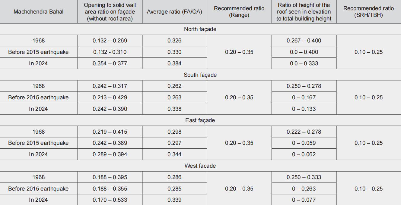 Though Bungamati has numerous features of ’Newar’ towns in the urban areas, nonetheless, the built form has adjusted to high topography and local context. Moreover, there are some unique architectural characteristics that represent Bungamati. Critical quantitative analysis of the ratio of area of door and window openings to façade area and the ratio of sloped roof seen in elevation to total building height over three different periods (1968, before the 2015 earthquake and in 2024) reveals many facts. Almost in all facades, the openings (doors and windows) are less than 30% of the total façade area (residential buildings only), which increased slightly till the 2015 earthquake (Table 3). However, the newly built houses in the post-earthquake period have large size of openings on the building facades. In some buildings, the openings cover more than half of the façade area. Traditional houses in 1968 had around more than one fifth (20%) of the total building height as sloped roofs seen in elevation, which was slightly reduced till 2015. Most of the new RCC structures have flat roofs and, in some cases, a minor slope is put over window projection. Hence, it is suggested to have the ratio of openings to façade areas in the range of 0.20 to 0.35 and the ratio of sloped roof height to total building height between 0.10 and 0.25.