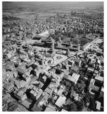 Fig. 6 Patan, aerial view of Mangal Bazar, and Darbār Square, featuring the palace complex, from the south-west. Photograph R. Kostka, November 1986