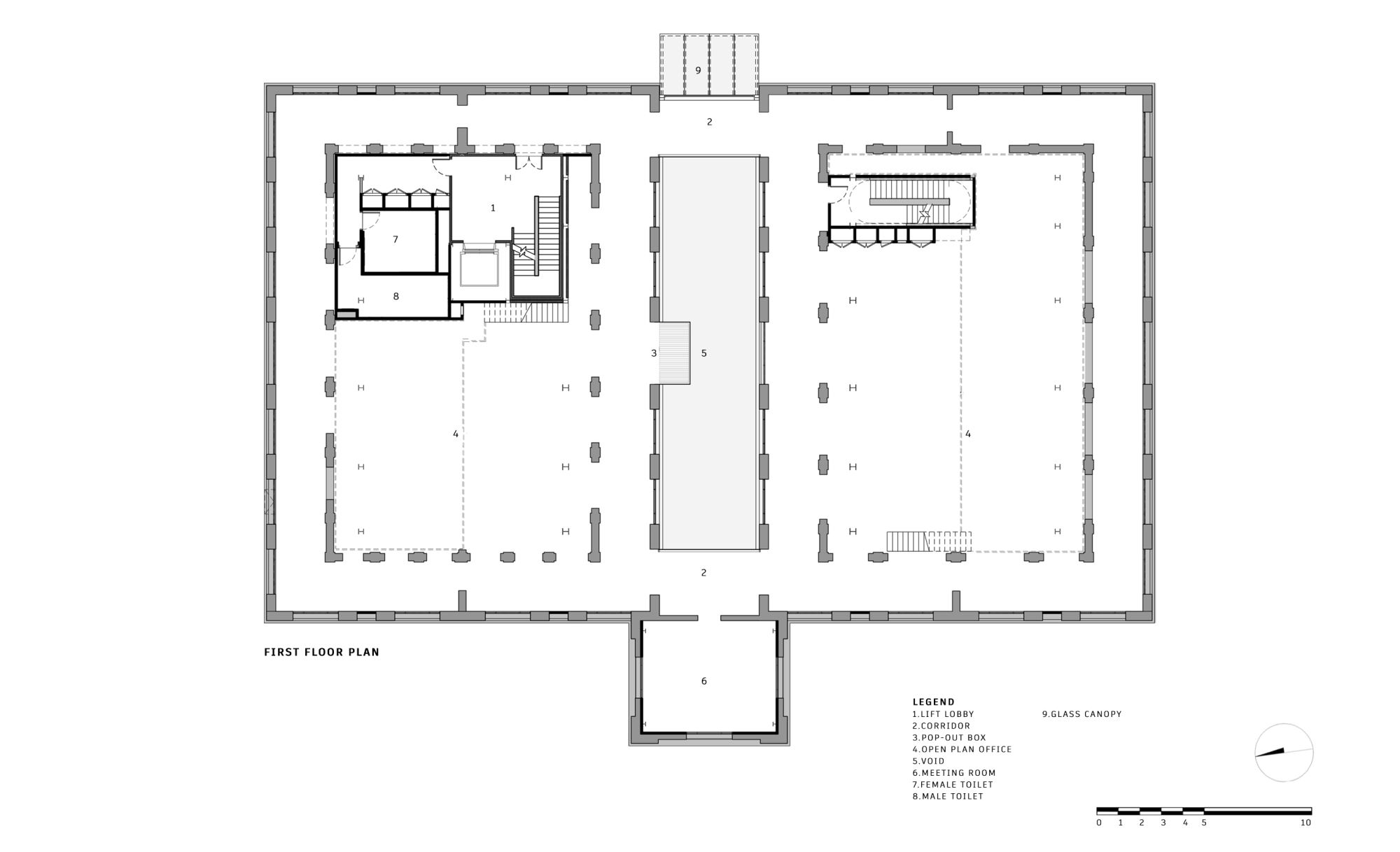 The overall gridline is generated by superimposing 3 grids include the original façade brick arched colonnades grid, an enlarged colonial brick laying pattern grid, and a new internal steel column grid.