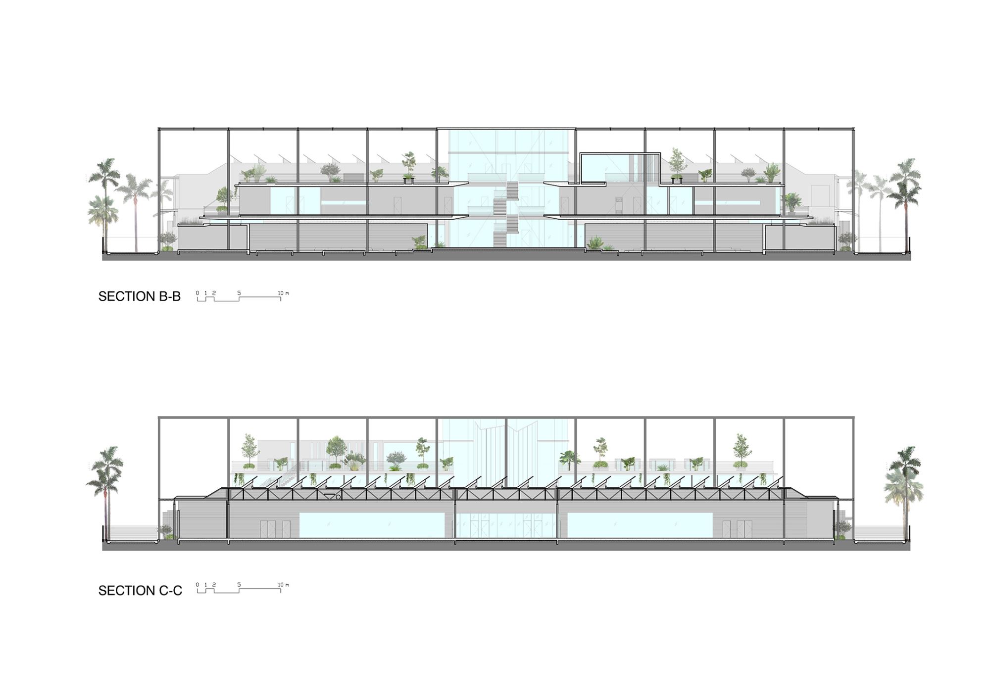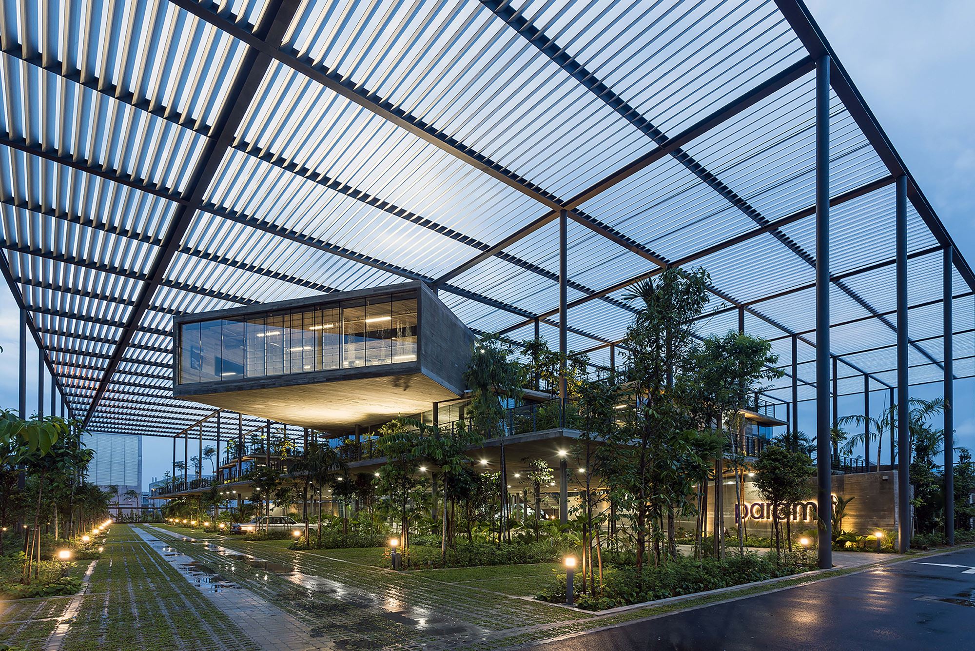 A canopy supported by a ‘forest’ of columns creates unity to ofce & courtyard while giving protection from the tropical sun. Ofce levels give access to roof gardens and staf are encouraged out for breaks, meetings or just contemplation. A green courtyard separates the ofce & factory with views and access from both. A bridge over the courtyard links the ofce & production, and this circulation route becomes a space for meetings, breaks & lectures.