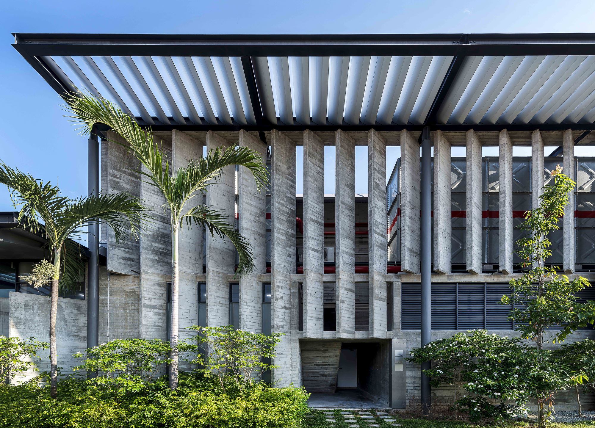 The factory has views to landscape and the sky condition through full height and clerestory glazing with the glazing protected from the sun by free-standing of-form concrete fns and roof louvers. Rainwater cascades from roof spouts – heightening awareness of tropical storms – to storage tanks for landscape irrigation. The plant receives natural difused light across the entire factory foor reducing dependency on artifcial lighting that, combined with chilled water foor slab cooling & cutting-edge air-conditioning technology, reduces energy consumption to half that of a conventional plant of similar size.