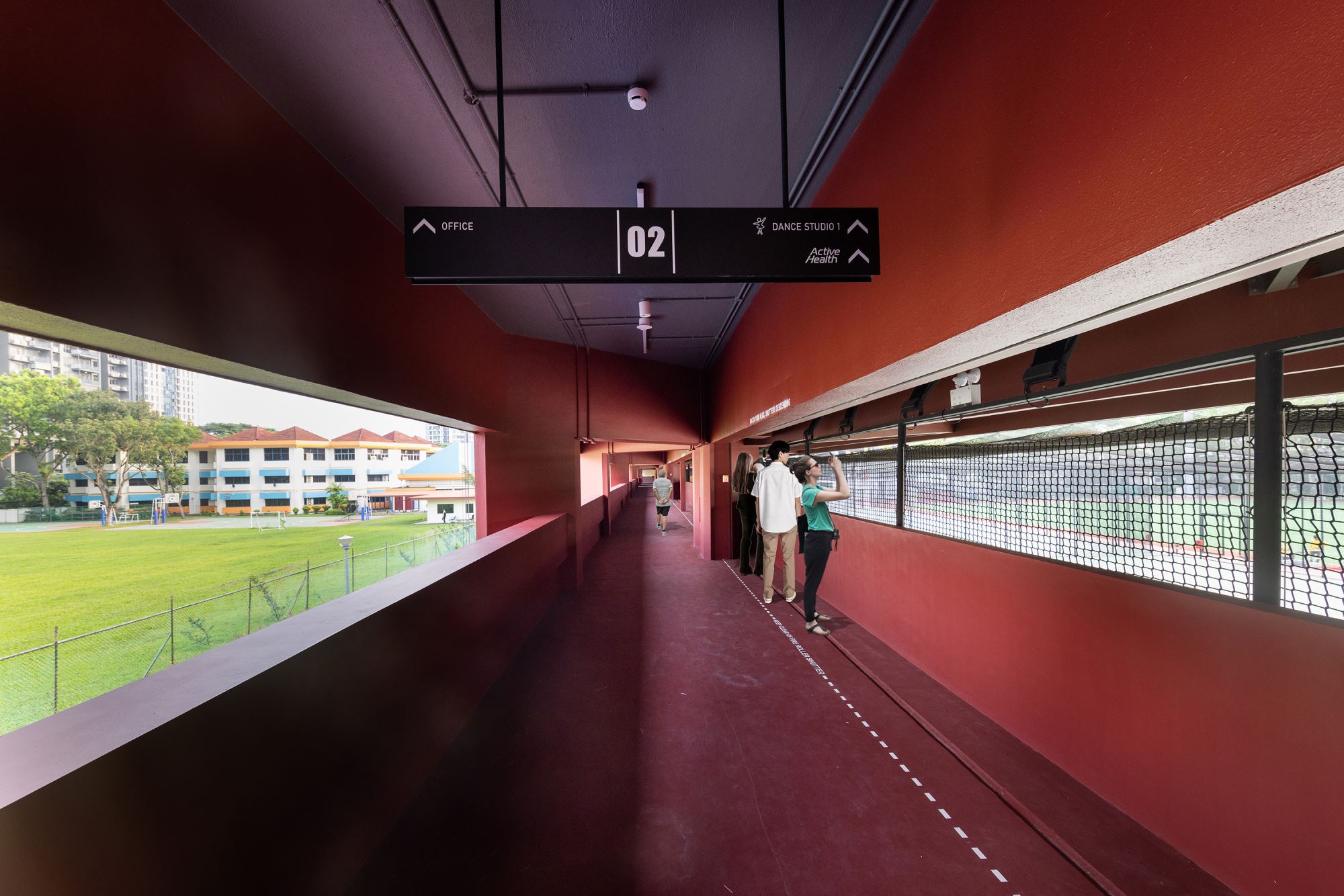 The intervention frst links up the venues previously operating separately as an integrated complex using "one active bridge". This is an elevated thoroughfare that extends the overhead bridge crossing Tiong Bahru Road into the complex. Along this promenade, the pedestrian is frst welcomed into the spatial volume with the sheltered teaching pool, then passes through and overlooks the hockey and futsal felds in the middle of the site, before reaching the indoor sports hall at the northern boundary.