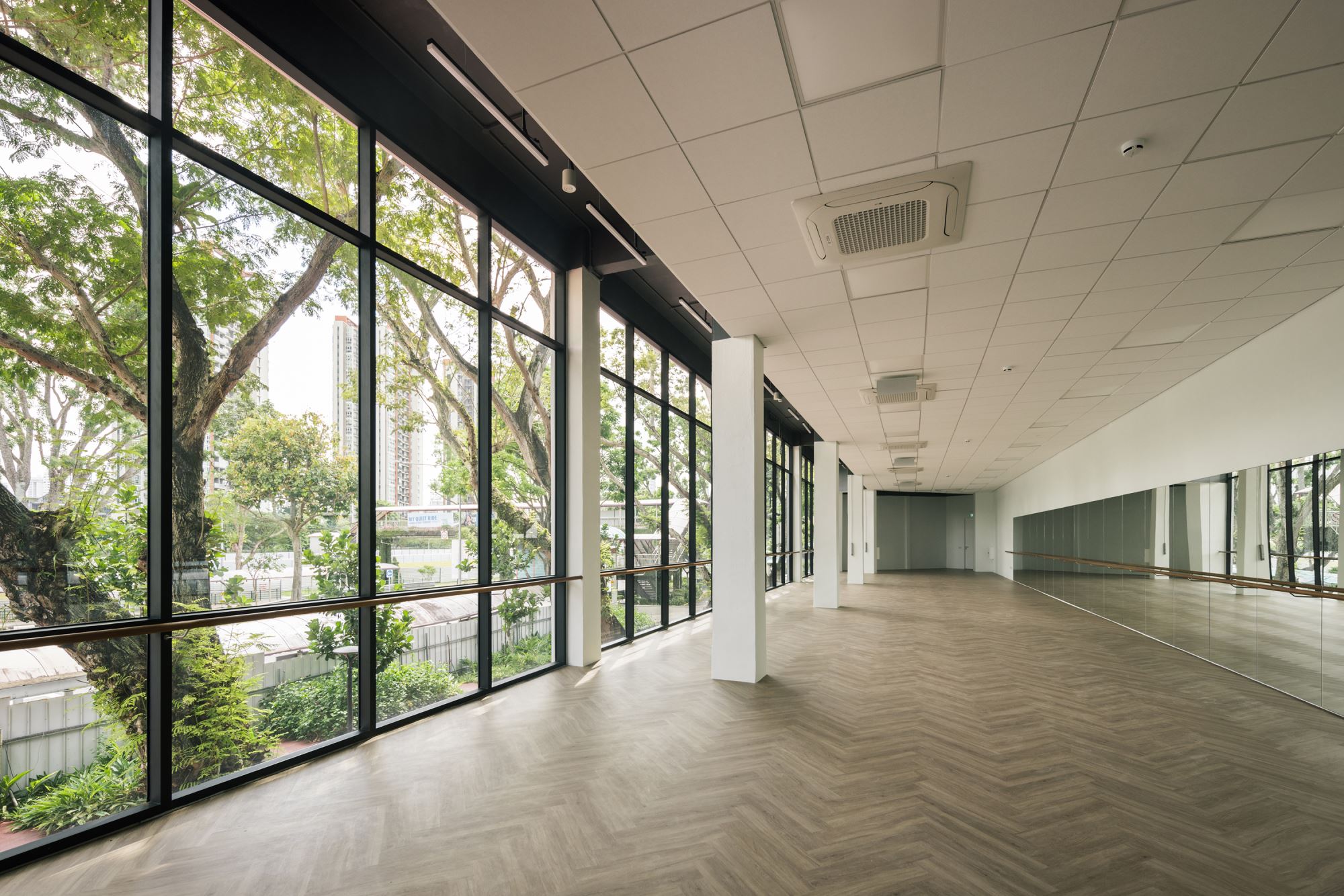 The complex relies largely on cross-ventilation in the public circulation passages, taking advantage of Singapore's mild climate. The multipurpose hall and bathrooms are naturally ventilated, supplemented by fans. The ftness gym is the only signifcant air-conditioned space. Here, angled cast-in-situ concrete fns and glazing in between create a jagged envelope whereby the opaque fns are oriented east-west, facing the incident sunlight, while the glazing is always facing north-south to receive light and allow views out. (Note the sun in Singapore comes from the east and west.) This confguration reduces heat gain into the space while creating an interesting and transparent profle for the form.