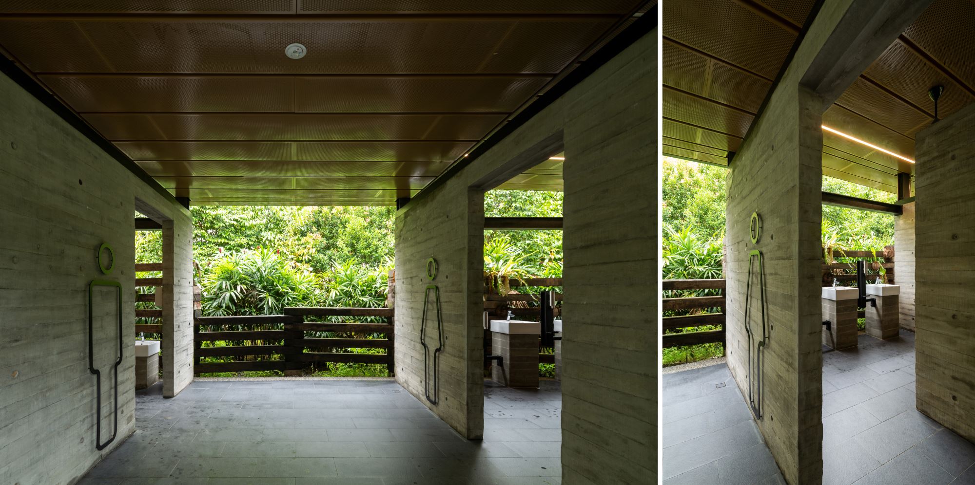 Both buildings have been fully restored today, nestled amongst the lush greenery of Bukit Timah Nature Reserve. The Station has been repurposed as a heritage gallery to showcase rail history, while the former Station Ticket Offce has been repurposed as a gathering base for the community to learn and share information on the greater Rail Corridor. The Quarters have been adaptively reused as an informal cafe and community-based photo gallery. The exterior green space has been enhanced as a delightful community node with quaint charm. A new lightweight standalone shelter with a lush green roof, in the spirit of kampong and rustic palette, was also introduced sensitively to house amenities, with another at Jalan Asas as "9 Mile Platform".