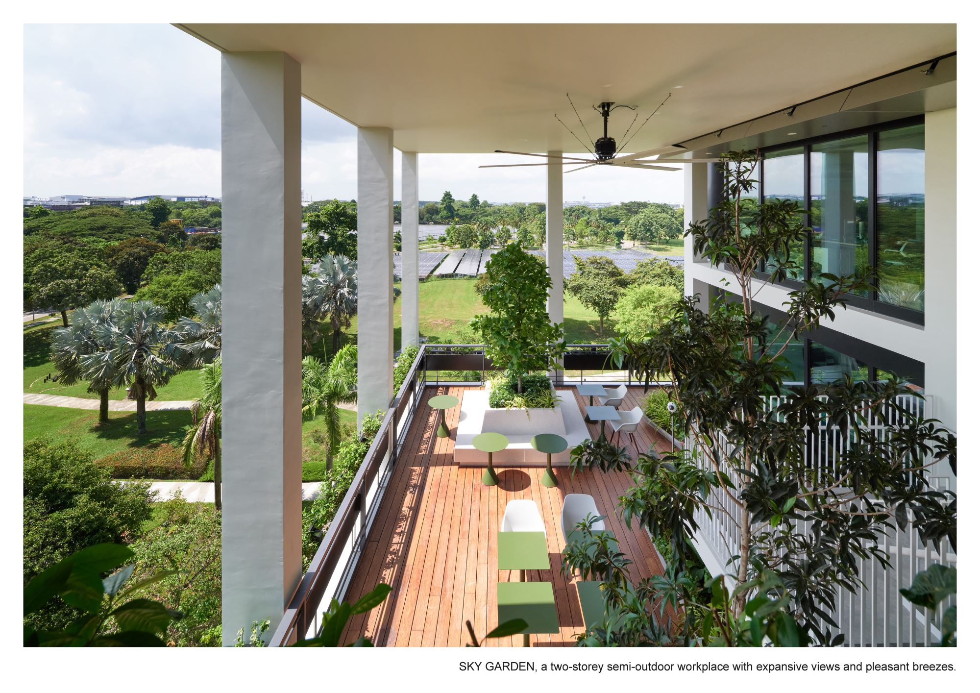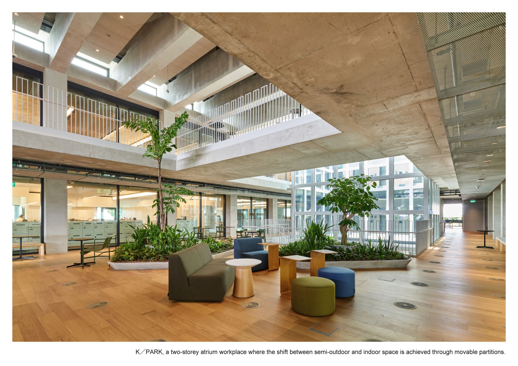 SKY GARDENS are featured on the north side facing a park. They are framed in deep grids that block direct sunlight, while visually embracing the greenery. K/PARK, a double-volume semi-outdoor working space, is on its ffth and sixth foors. This green-flled environment also acts as an experimental space for biophilic design. By employing elements of nature and computer simulations to optimize the interior environment, the building achieves aesthetic and functional excellence while standing as an icon for sustainability. The GEAR received BCA's Green Mark Platinum (SLE) and the frst WELL Certifcation v2 Platinum for the newly built structure.