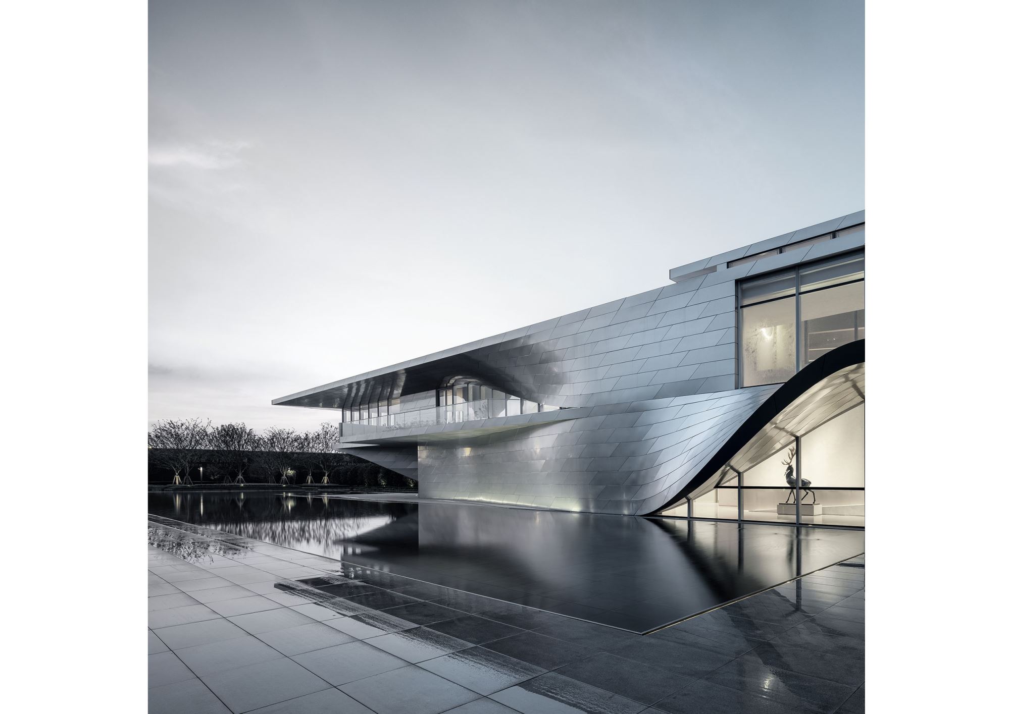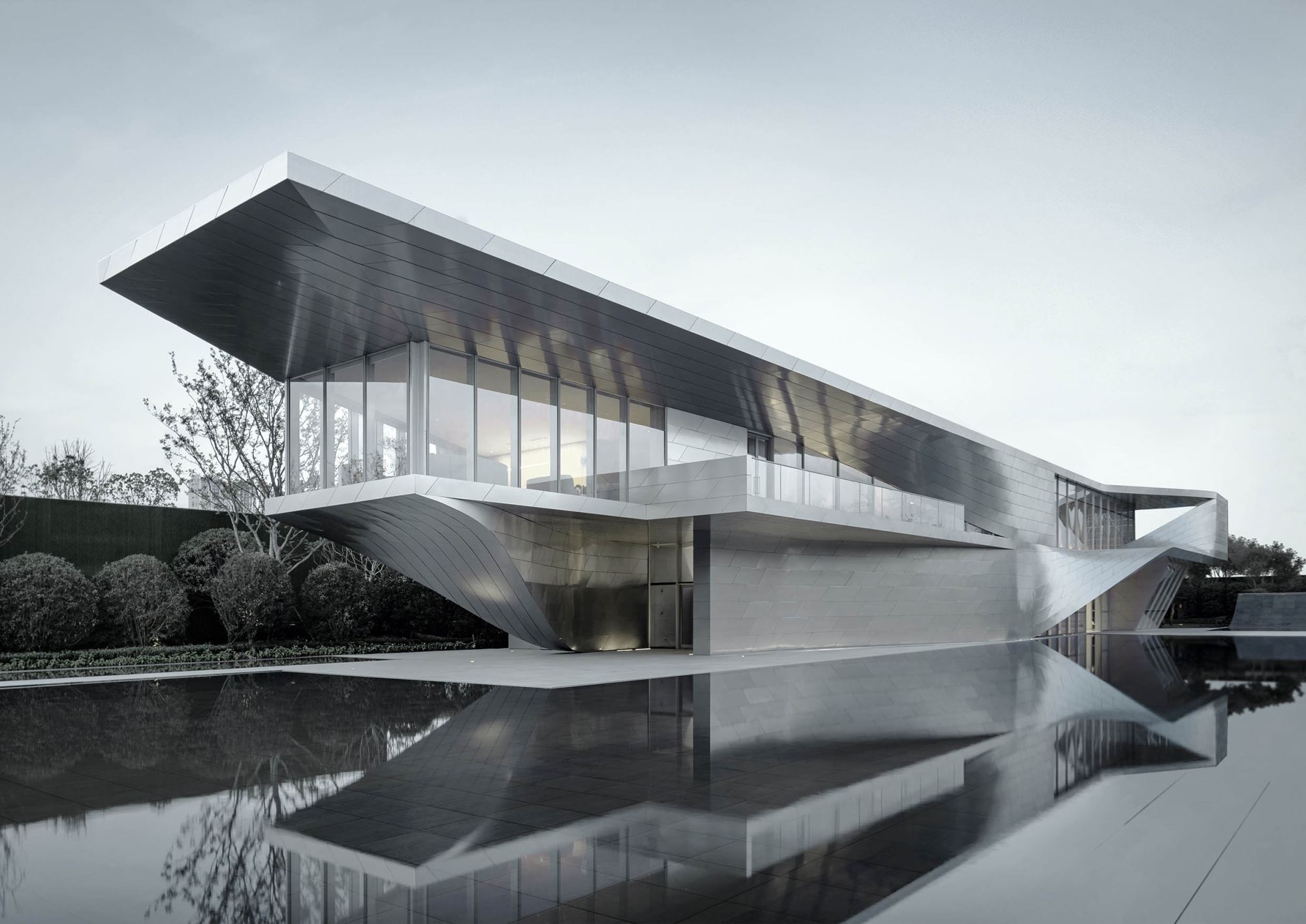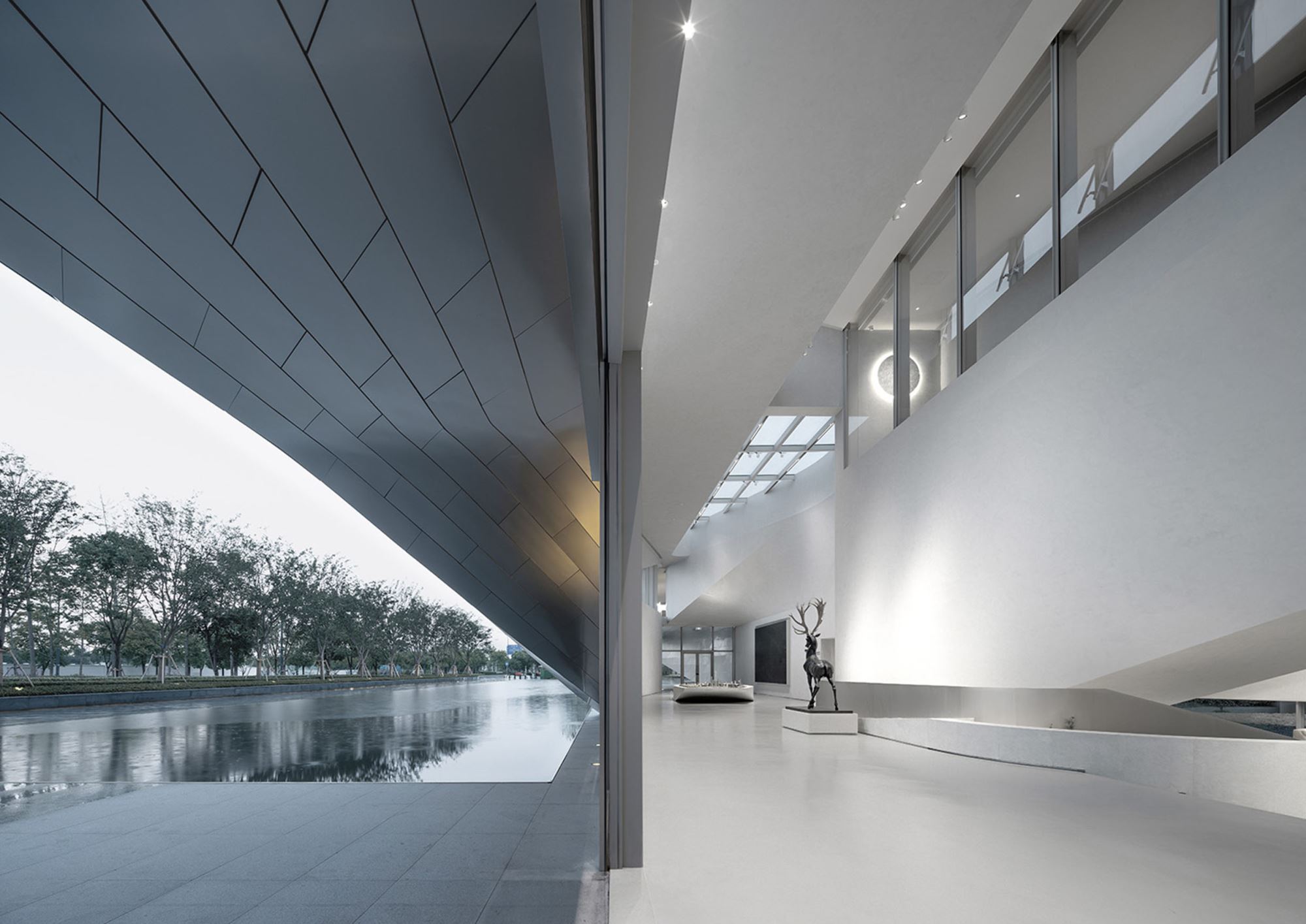 Located at the southern end of a new commercial and residential development, the Nanjing Art Center in Nanjing, China, creates a landmark in this new urban development. The design concept iterates a series of linear elements that twist in section of this two-story volume to combine wall and floor in a single sinuous gesture.