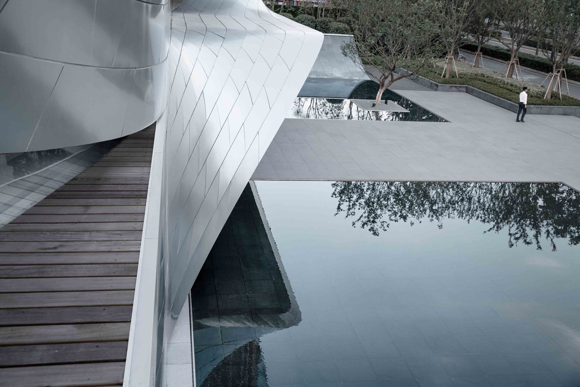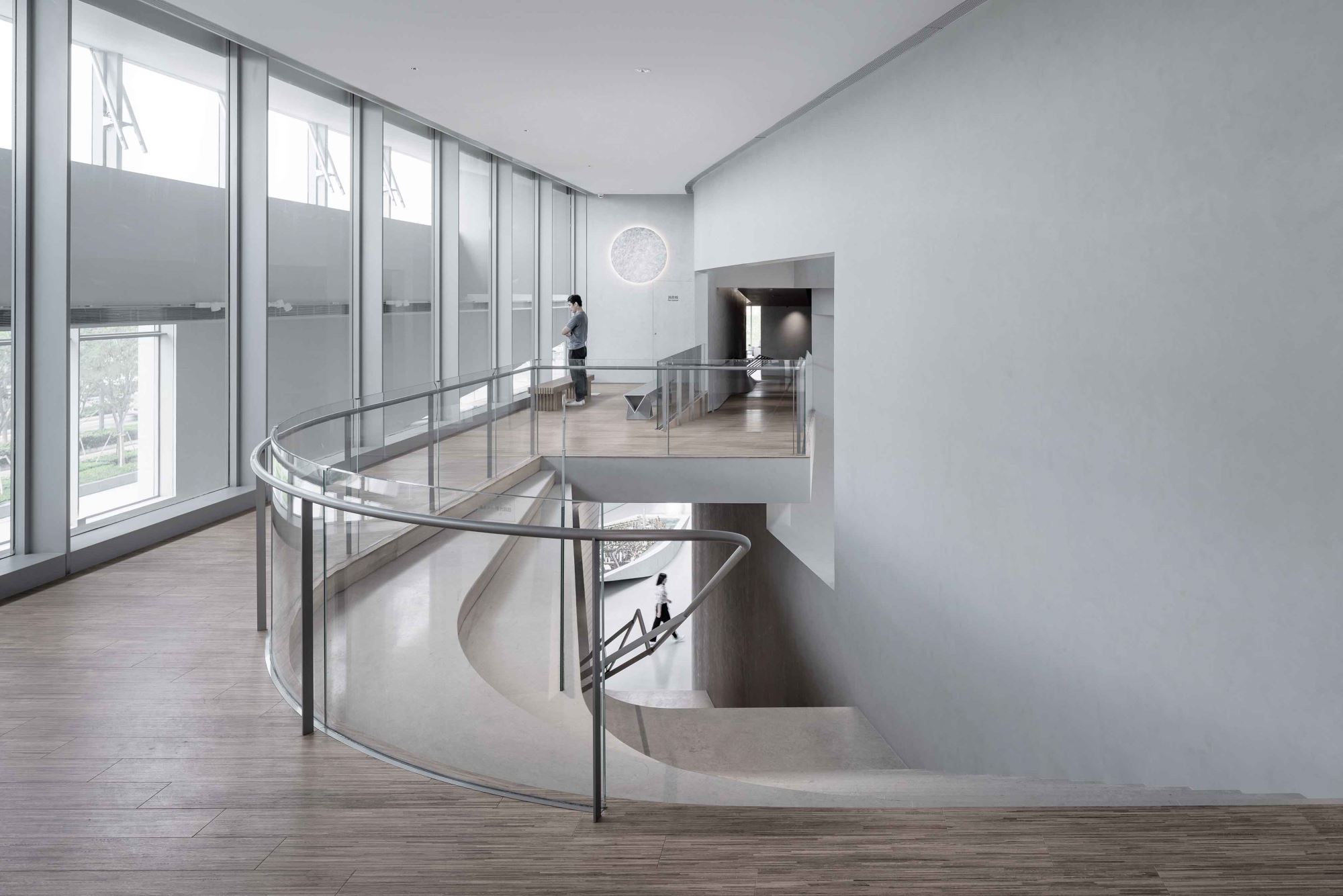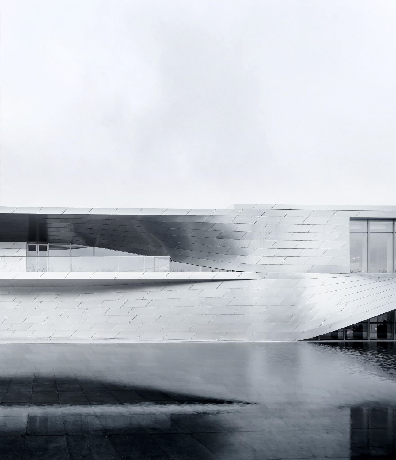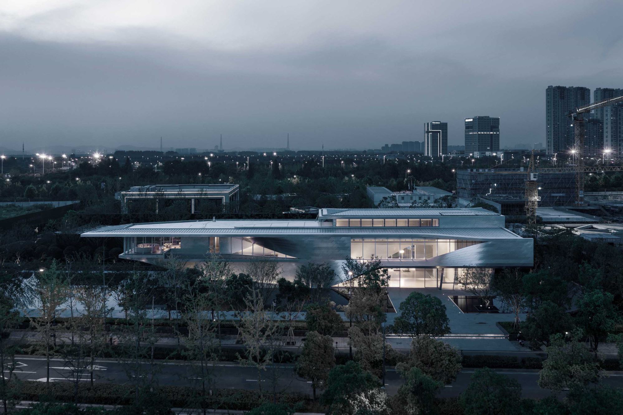 Located at the southern end of a new commercial and residential development, the Nanjing Art Center in Nanjing, China, creates a landmark in this new urban development. The design concept iterates a series of linear elements that twist in section of this two-story volume to combine wall and floor in a single sinuous gesture.