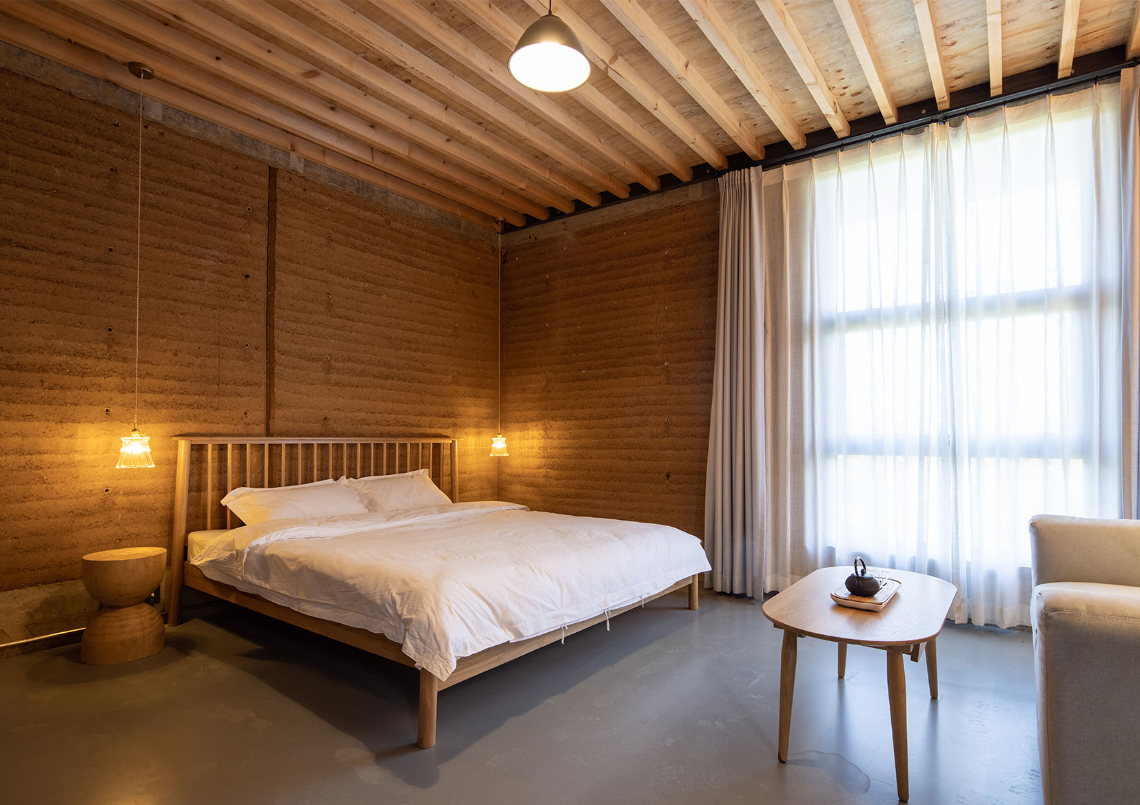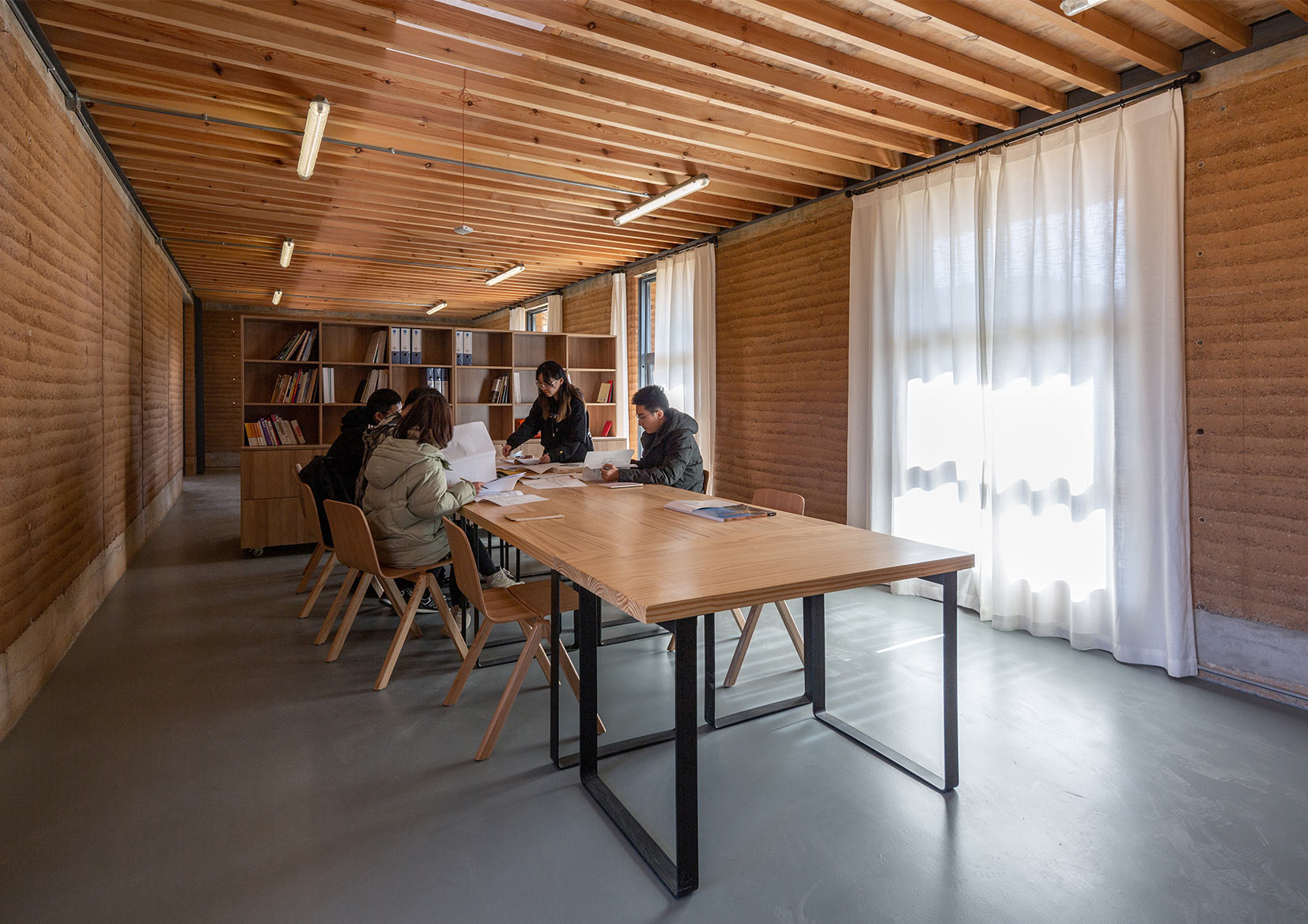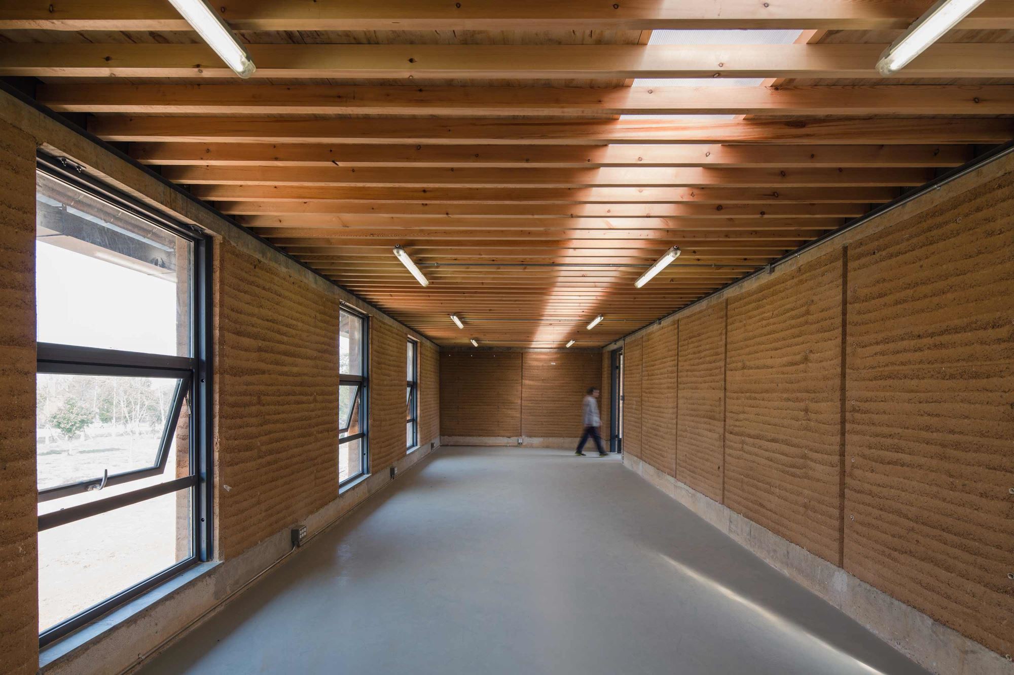 Integrated with semi-outdoor spaces to provide a comfortable and artistic environment for its users, the center also uses passive design—natural daylighting, natural ventilation, thermal mass, and shading—to create an optimal interior climate with low operating energy consumption. This conscious approach also extends to materials. All the materials used in the wall are natural materials such as raw earth, gravel, and sand. No industrial stabilizers, such as cement, was added in the earth wall, which is 100 percent recyclable, degradable, and pollution free. The benefits of these walls are twofold, as results from several mechanical property tests and shaking table tests corroborate that the seismic performance of the rammed-earth building has been significantly improved, thereby successfully meeting the standards of local seismic codes.