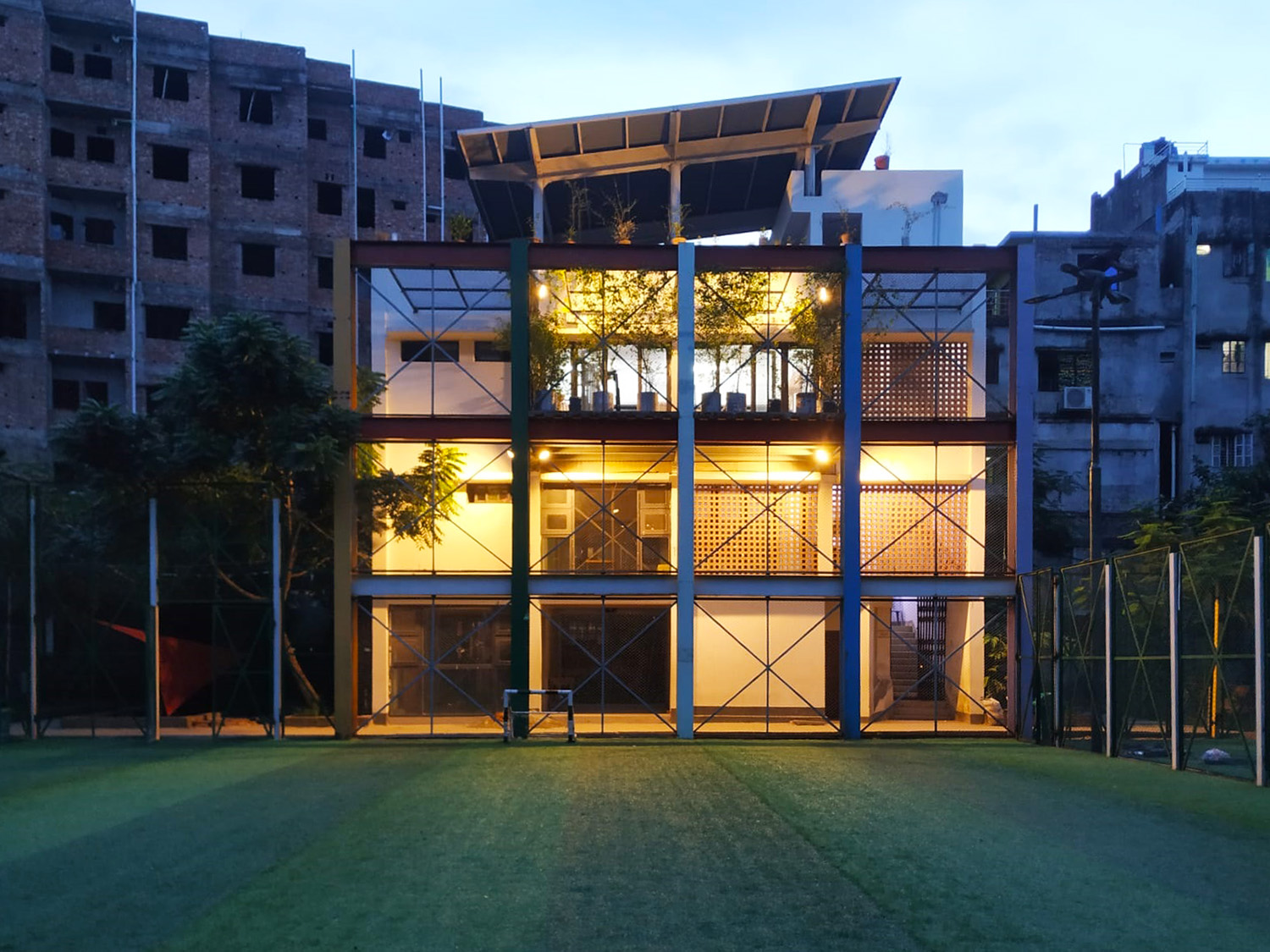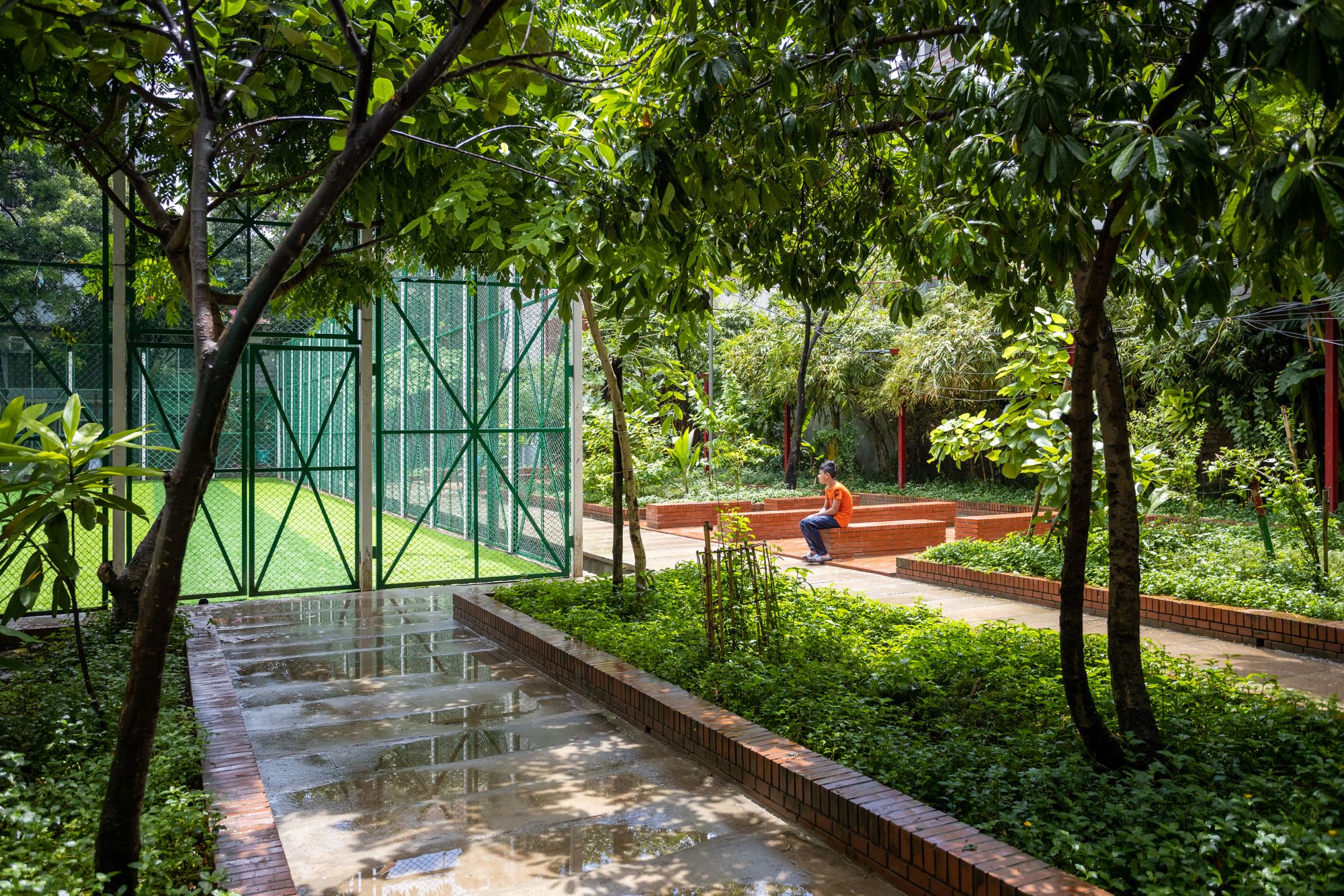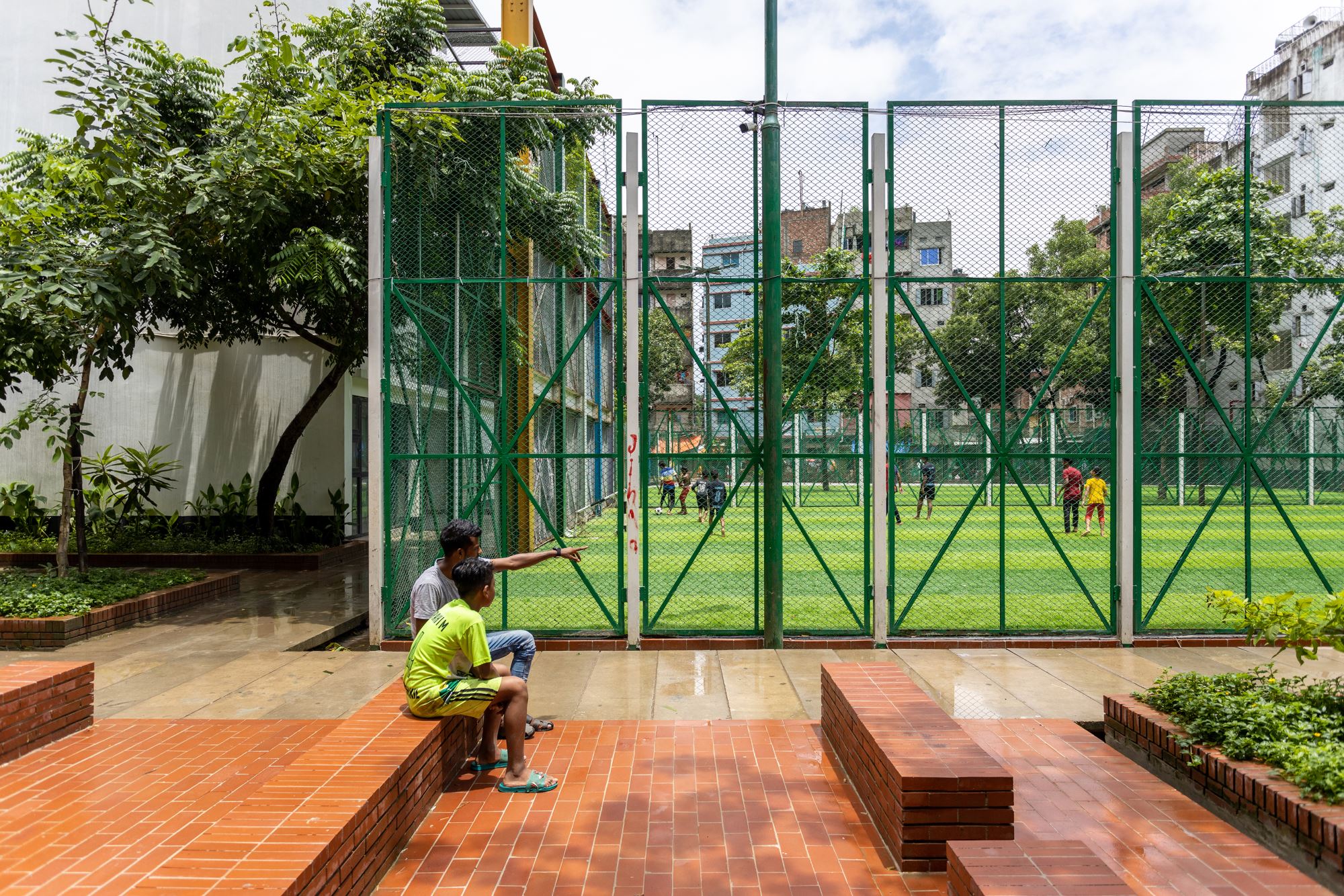 Three major aspects have been addressed with the completion of this project. The first is water management via a new rainwater collection trench that harvests and filters 100,000 liters (which works out to 250 millimeters per day) of excess water to reroute it to newly added public facilities and the nearby mosque after funneling sewage out of the system. The second is community relations, to kindle renewed trust and respect among locals. This was spurred by dismantling the north boundary wall and granting round-the-clock accessibility. The newly built promenade, walkways, orchards, and restored playing fields make the park a community courtyard for all. The third is functionality, which has been established by freeing up the illegally occupied veterinary clinic building by the park and transforming it into a multipurpose facility with a library, gym, women's club, filter room, councilor's office, rooftop coffee shop, and other facilities. These changes and the collective efforts of those involved in the project have filled the air once again with the musical giggling of children and made this once run-down park a celebration of the community.
