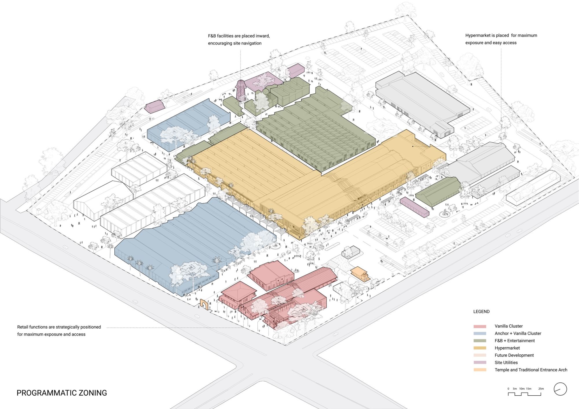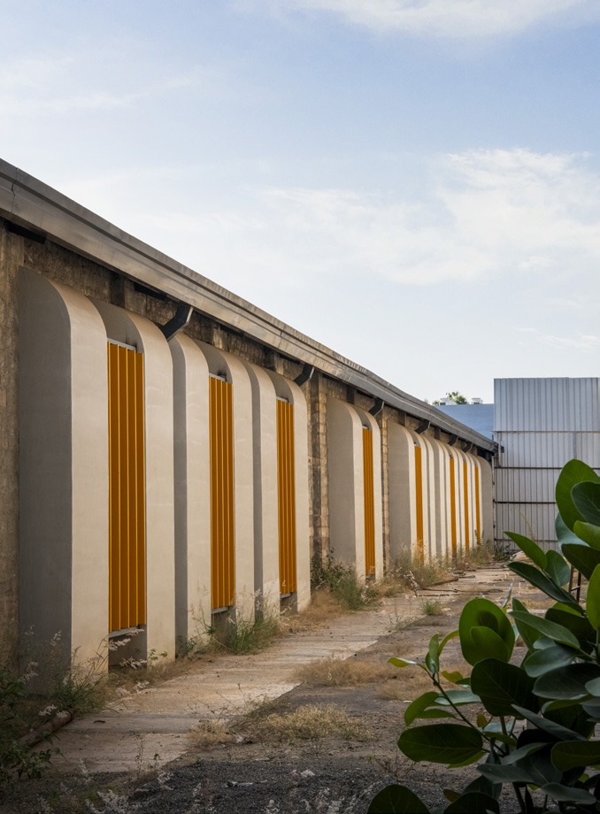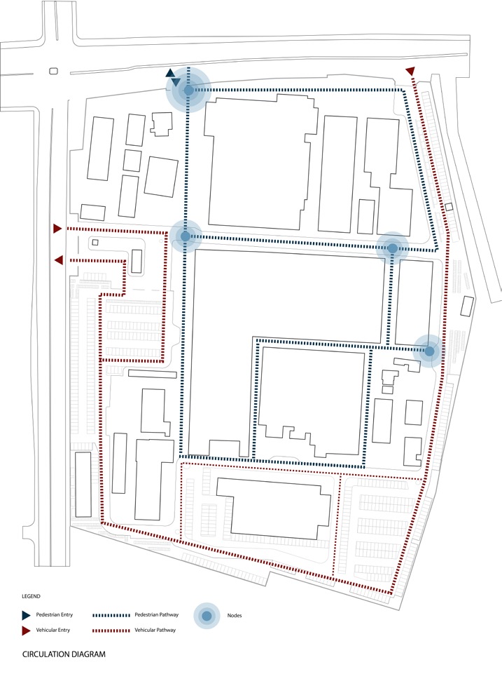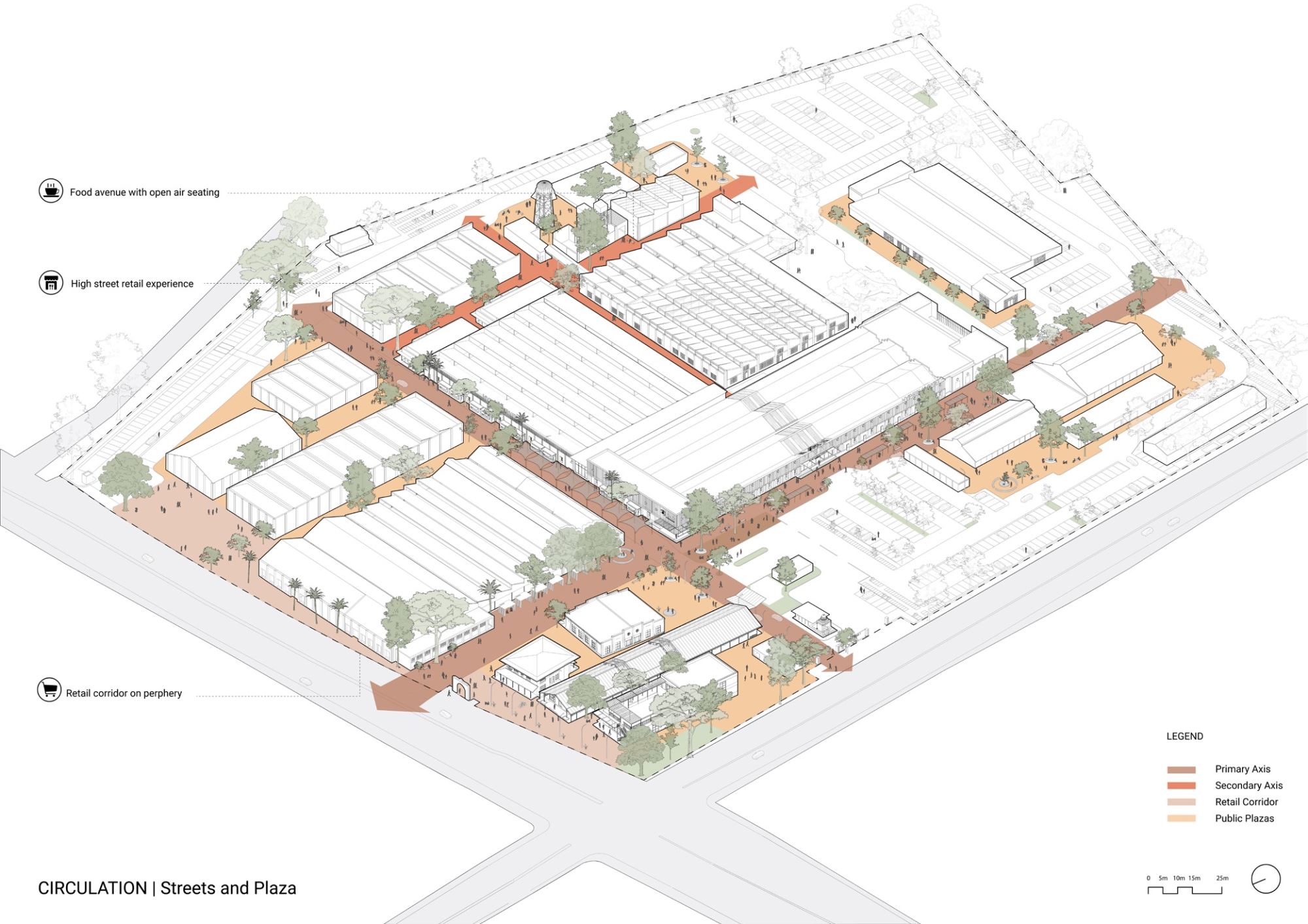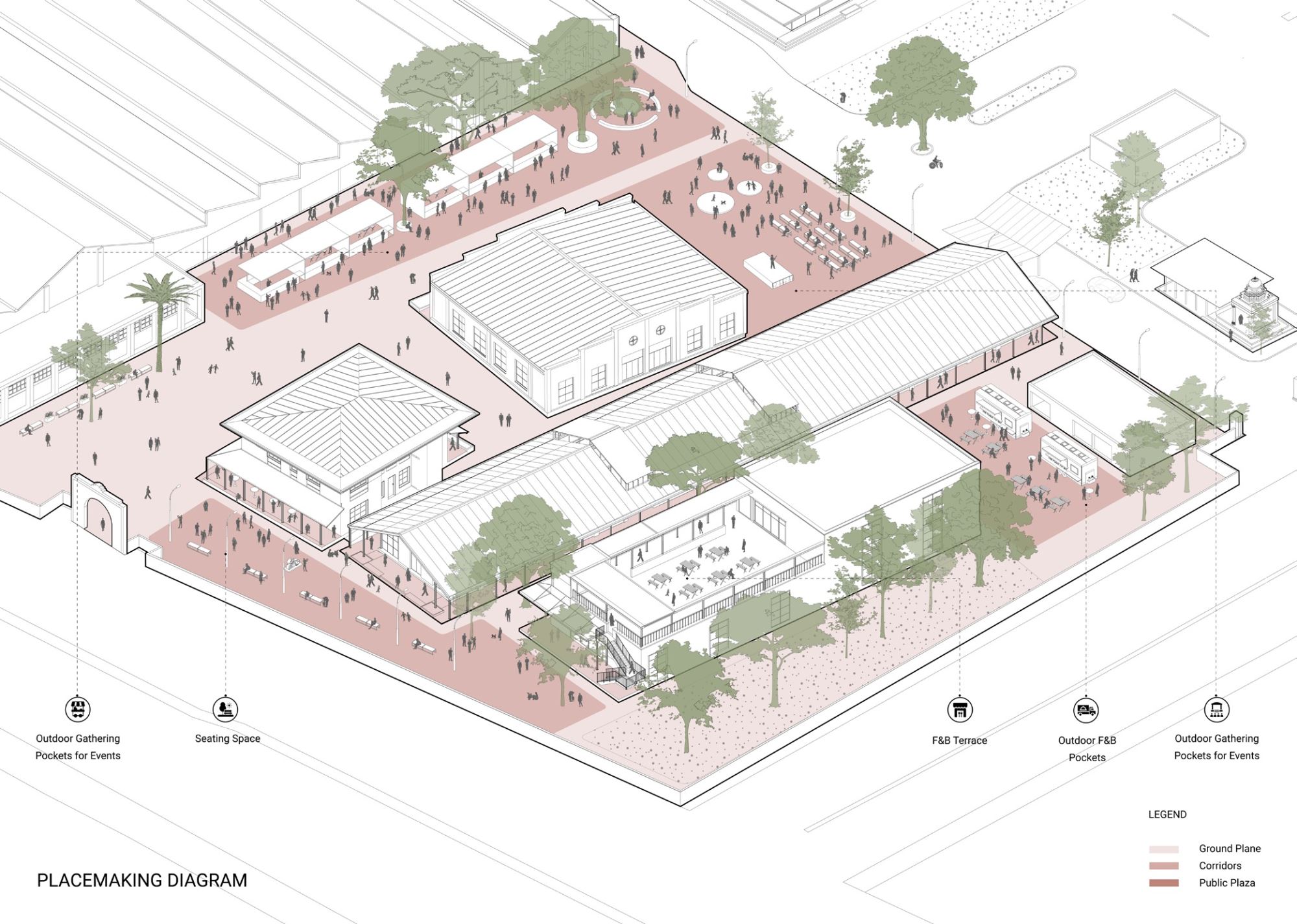Straddling a major trafic artery, the 84,984 square meter site functions as a walkable community hub with a host of public functions. A visually permeable boundary wall was designed to blur the lines between the precinct and the surrounding neighbourhood. Specific structures and sheds were earmarked for demolition or restructuring to enhance circulation and functionality, while vehicular access was restricted to the periphery to prioritize walkability and create a pedestrian-friendly environment. Open green areas and avenues lined with shade-giving trees have been integrated into the design scheme as a counterpoint to the site's industrial landscape, ofering respite from the urban bustle. Secondary walkways have been reinforced, linking public nodes and providing diverse routes for circulation, further encouraging exploration and discovery. Wayfinding totems are thoughtfully placed to improve connectivity, while historical accounts and plaques elevate the experience by facilitating guided narrative walks and tours.