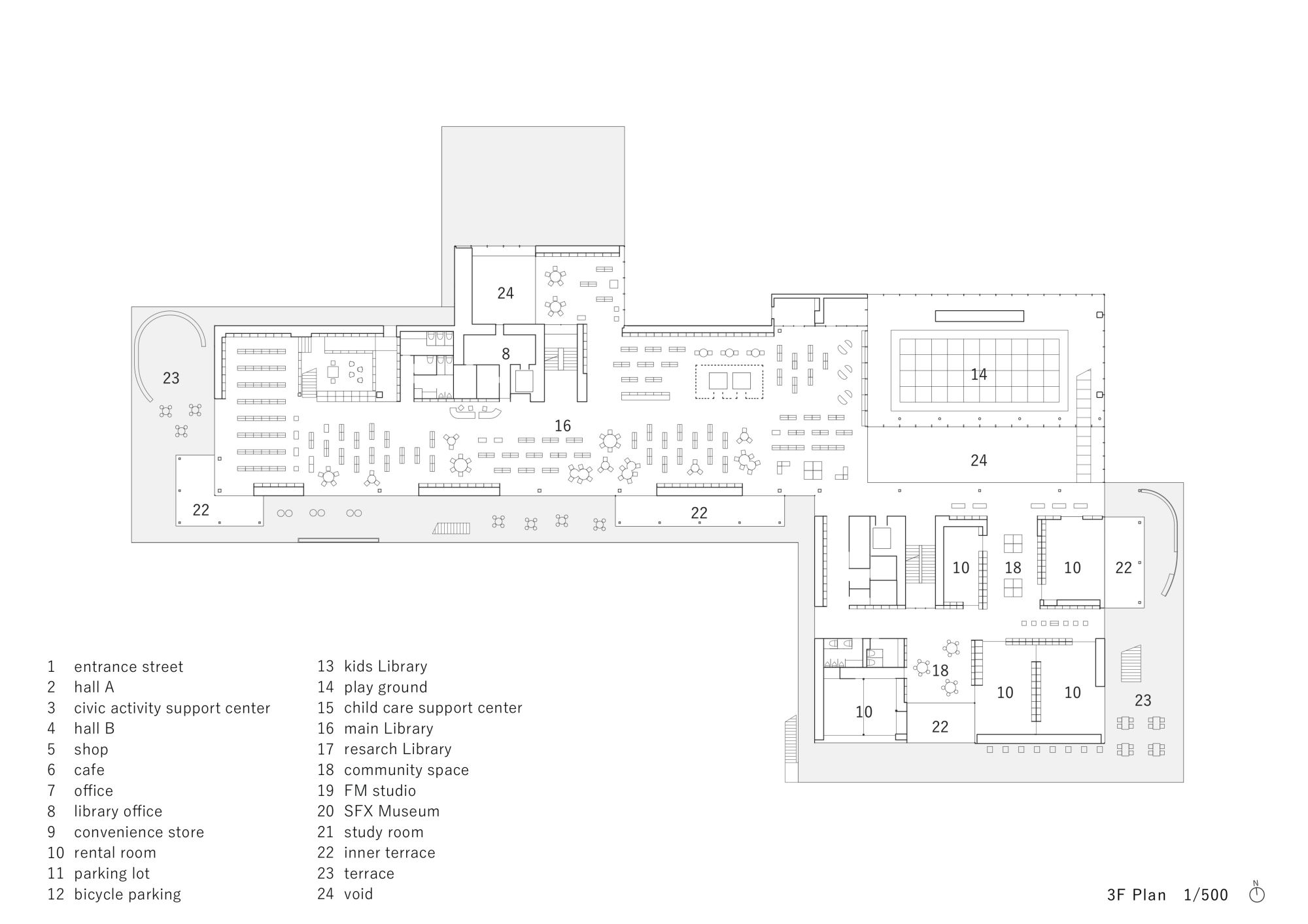 The Sukagawa Community Center offers a wide range of cultural and recreational activities that are assigned different activity themes, such as “Raise” “Play” “Create” “Learn” and “Meet”. The facility is divided into different areas of action offering various opportunities for people to meet, to engage in activities, and to interact with knowledge. The Sukagawa Community Center is designed to transcend functional boundaries and enable a complex experience by reinterpreting the building typology of a public community center. With the complex structural layout of the community center, as well as the reclassification from conventional categories into activity-oriented themes, an architectural solution that addresses the need for a public forum and which simultaneously creates a long-lasting and versatile relationship between the city and its citizens is provided.