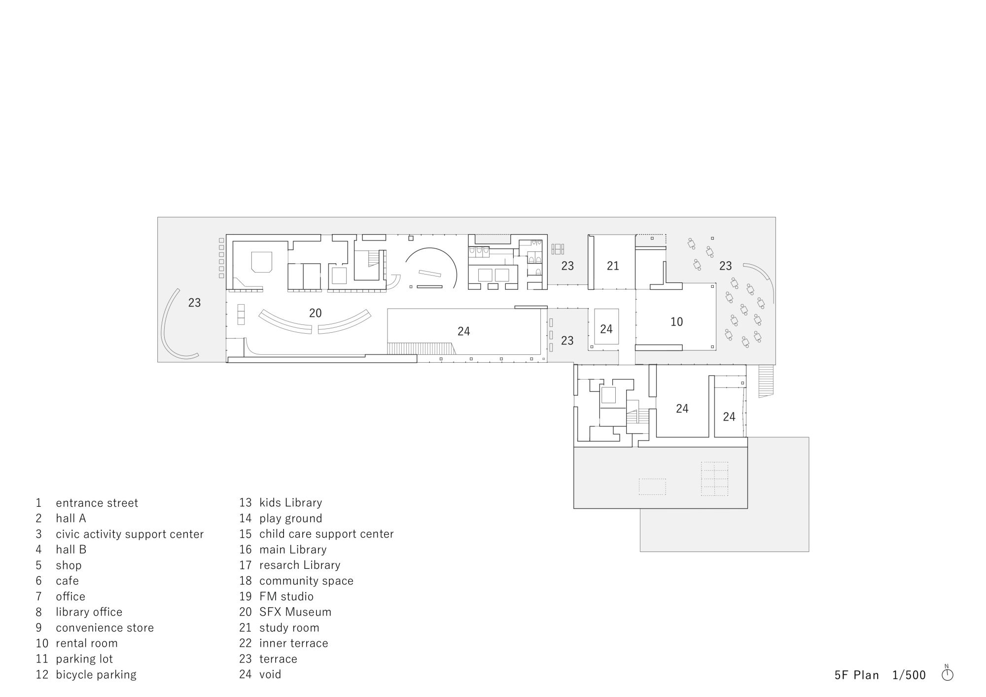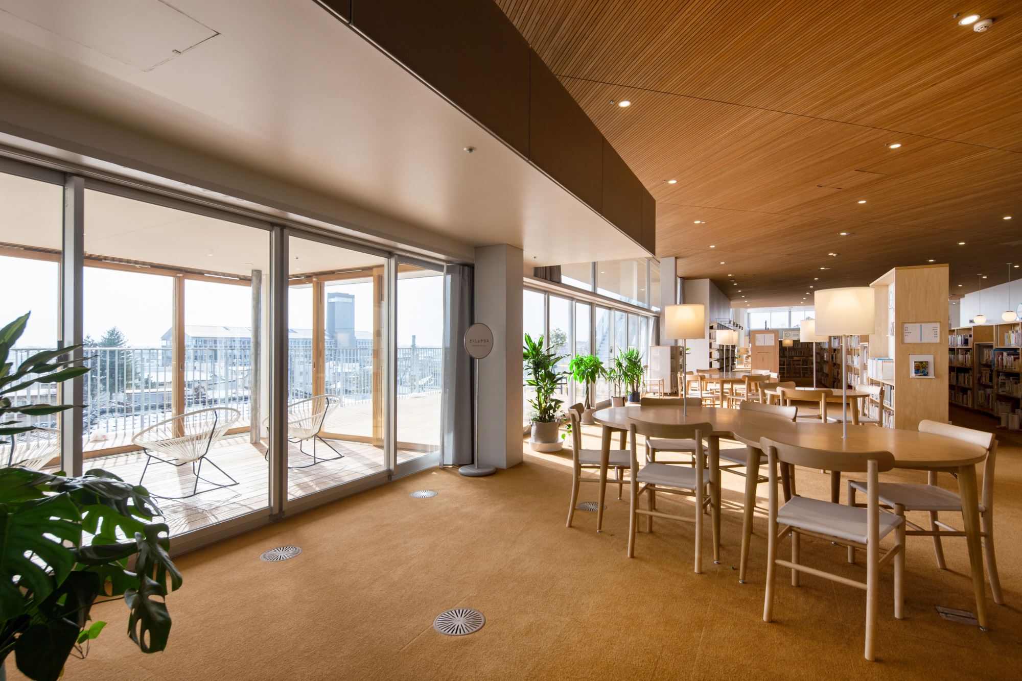 The first floor, which serves as the main entrance to the facility, is a sloping space integrating the 2.5-meter elevation difference of the site. The waiting area, café, and event space located on the first floor are connected with the outdoor space and seamlessly integrated into the hilly cityscape of Sukagawa. The second floor houses children-focused amenities, such as a kids’ library and an open, two-story playground. Located on the third floor is the main library, as well as a number of rental rooms and inner terraces, which allow for quiet working, and which also provide socializing spaces, respectively. The library extends across the fourth floor, where more rental rooms and an open community space are located. The museum is located on the fifth floor of the facility.