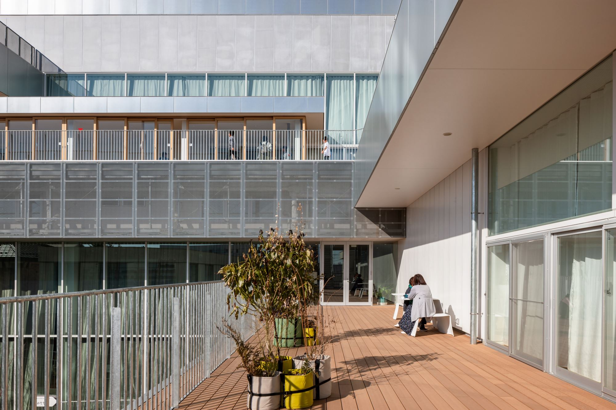 The center is designed as an interlocked structure based on different floor slabs, divided into small sections and staggered, to form an incremental setback on the site facing the historic main street. The building’s architecture, thus, offers many terraces, providing further outdoor activity and socializing spaces, while the recessive façade of the building allows sufficient distance from the neighboring houses.