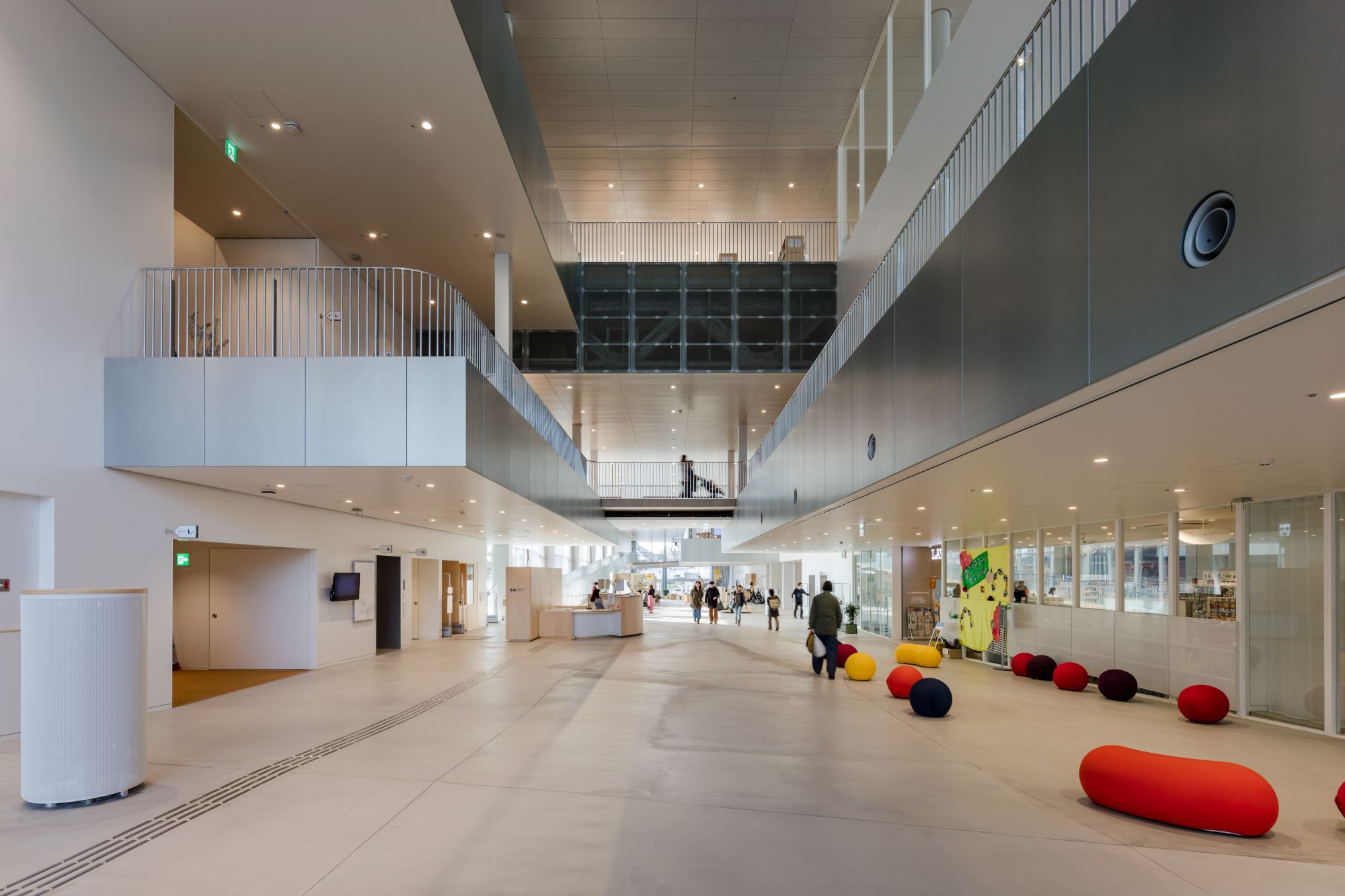 The interior structure is characterized by an open floor plan and offset floor levels that partly appear to float freely in the cavity of the center, creating various voids and dynamic open views throughout the different floor slabs. In order to realize this complex structural system, a megastructure comprising the third and fourth floors—that entails a steel frame composed of trusses— was designed. The cantilevered slab of the lower floor is suspended from the megastructure and supported by columns on the upper floors, the positions of which are shifted accordingly to bear the load. Further, the trusses provide space for the installation of air-conditioning equipment, as well as smoke exhaust routes in case of a fire; it also serves as a sound-absorbing layer protecting the quiet environment of the library on the upper floors from noise filtering in from the lower floors. The upper floors are connected by gentle slopes and stairs, which allow visitors to walk around the entire building as if taking a walk around the city.