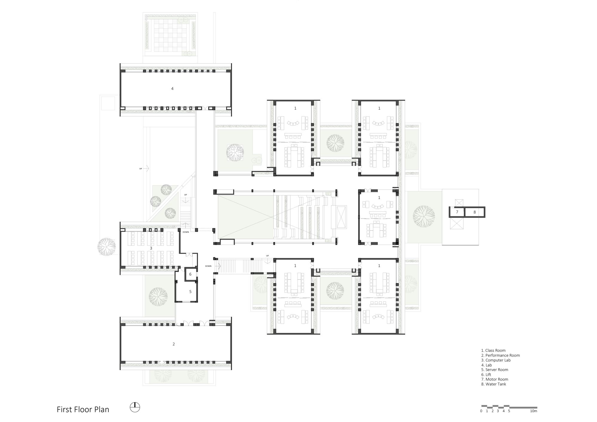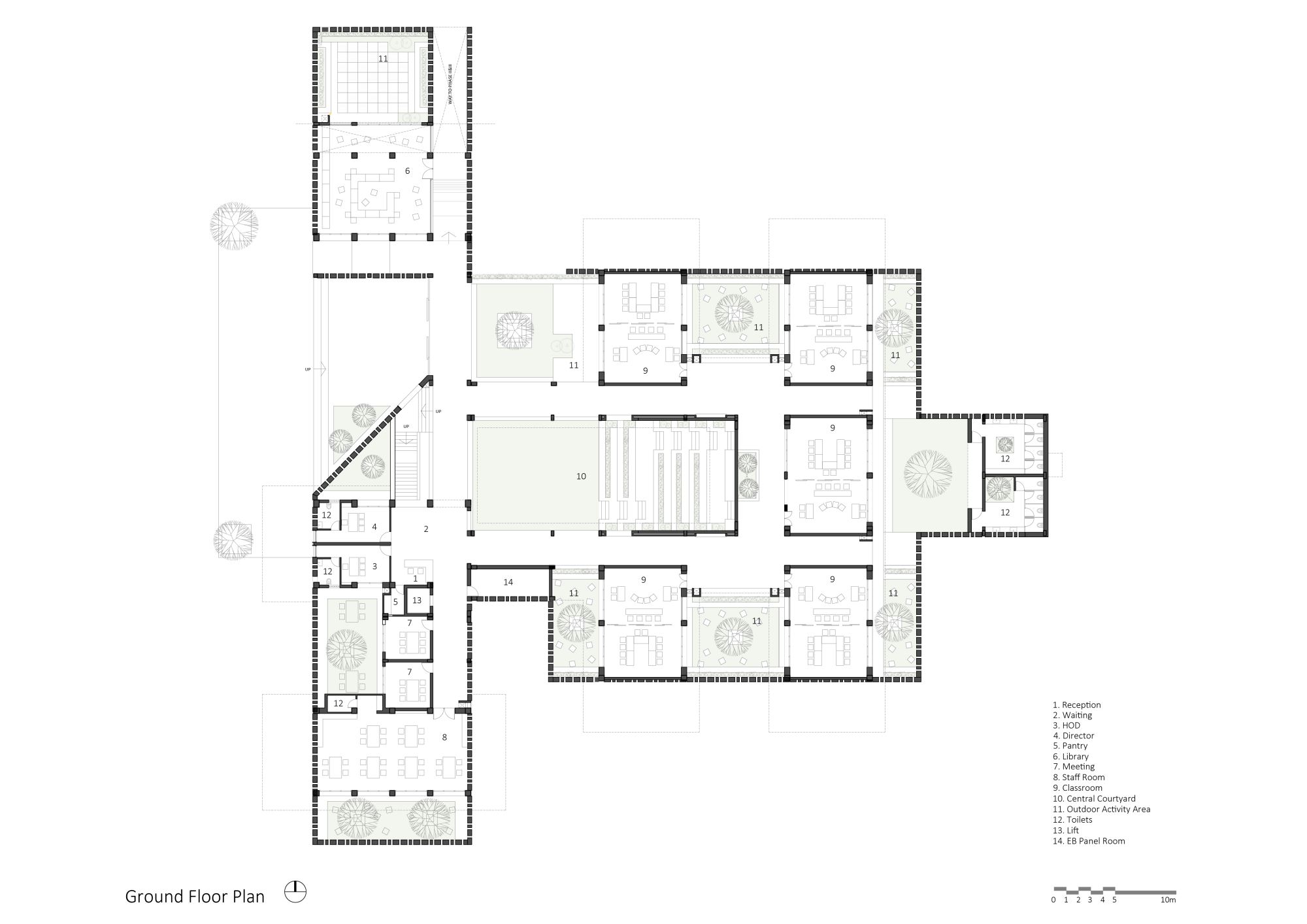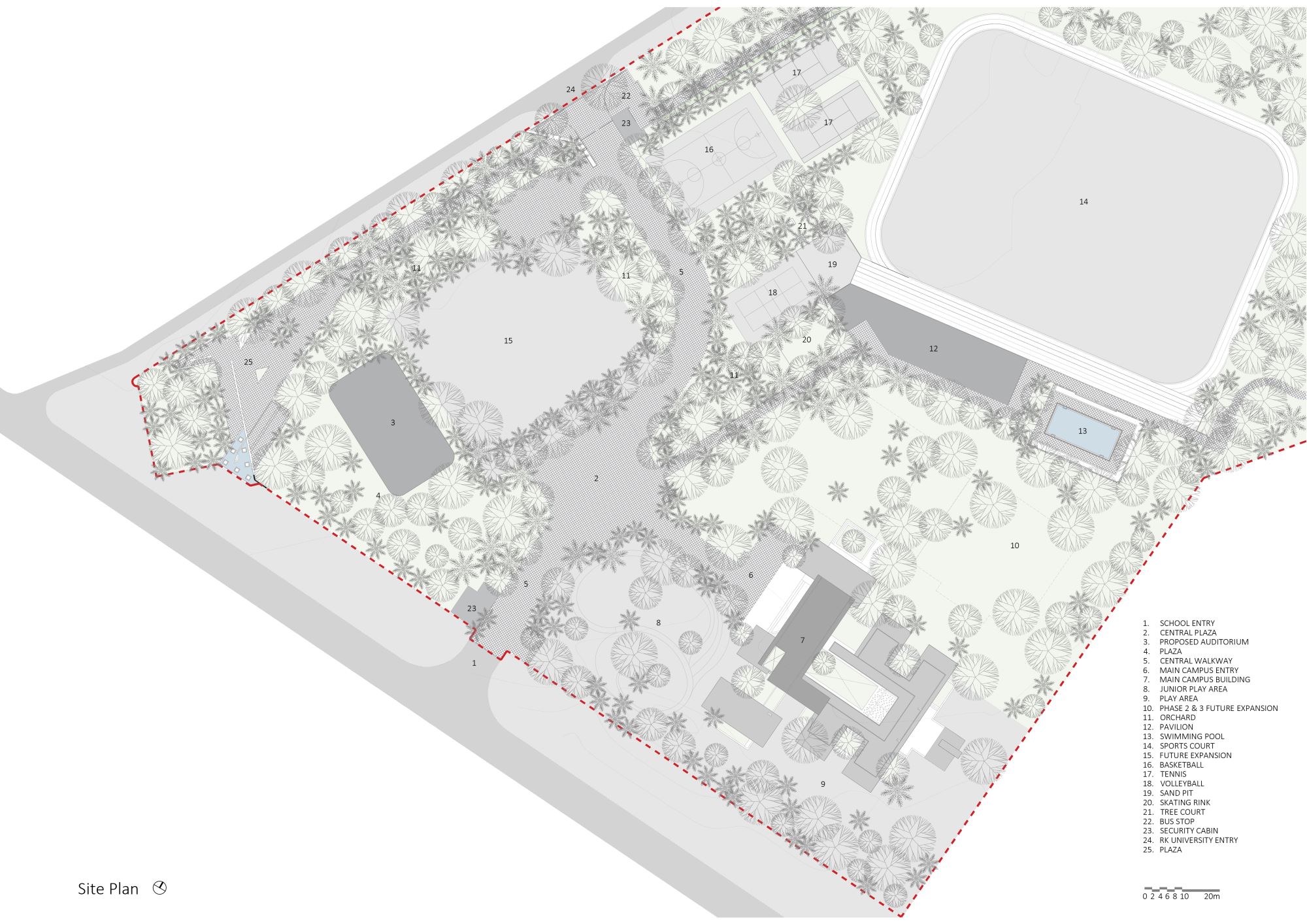 The semi-arid climate of north-west India, dusty yet windy site conditions, 20~30 days of monsoons in Rajkot and supply of STP water from RK University were influential contextual pointers. Overall master planning was conceived integrating three phases of development of which only Phase -1 is built. Open- ended corridors, building orientation and future development were factored into the overall planning. Key functions are accommodated in ground and first floors to keep the built space child friendly.