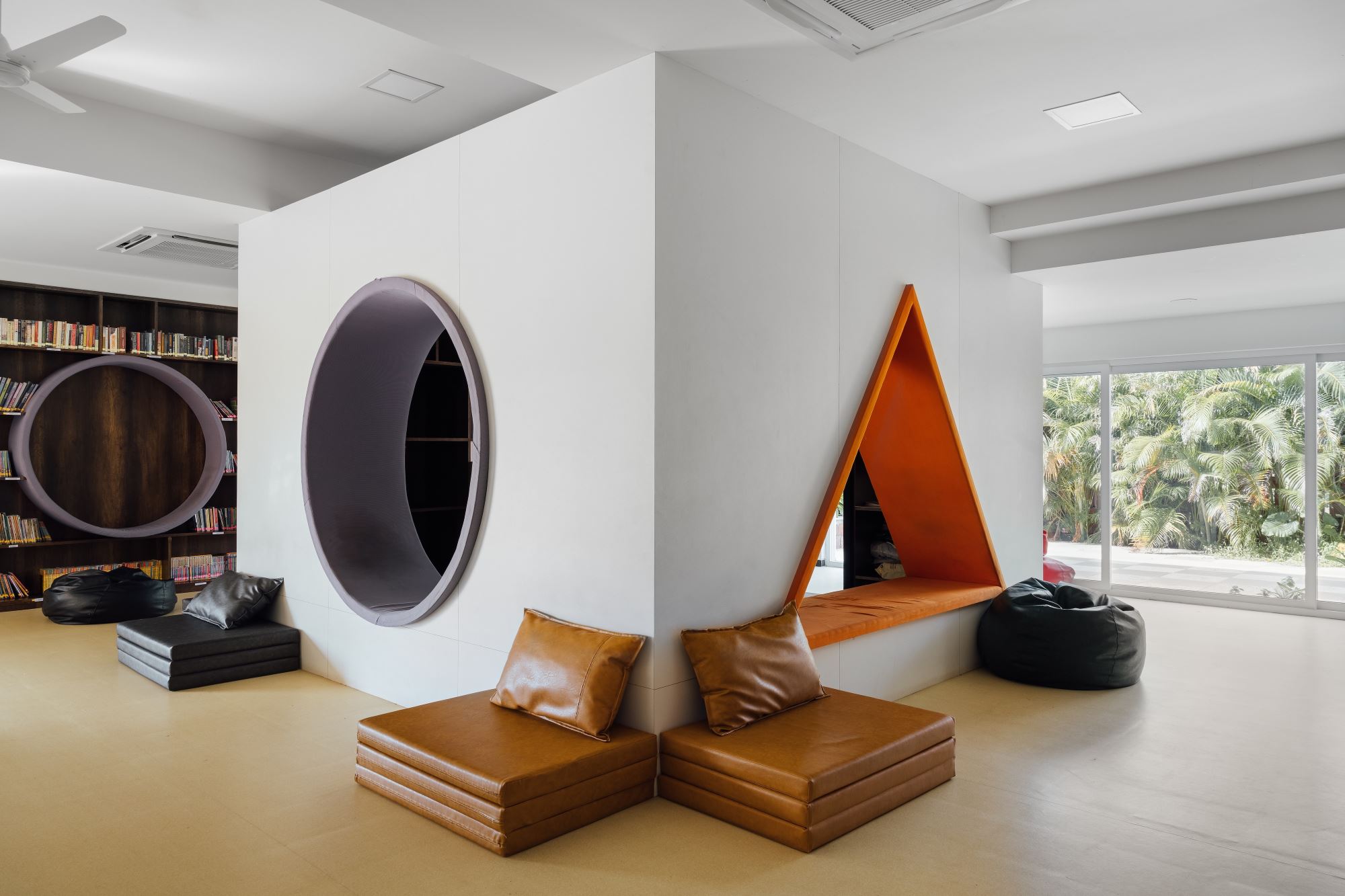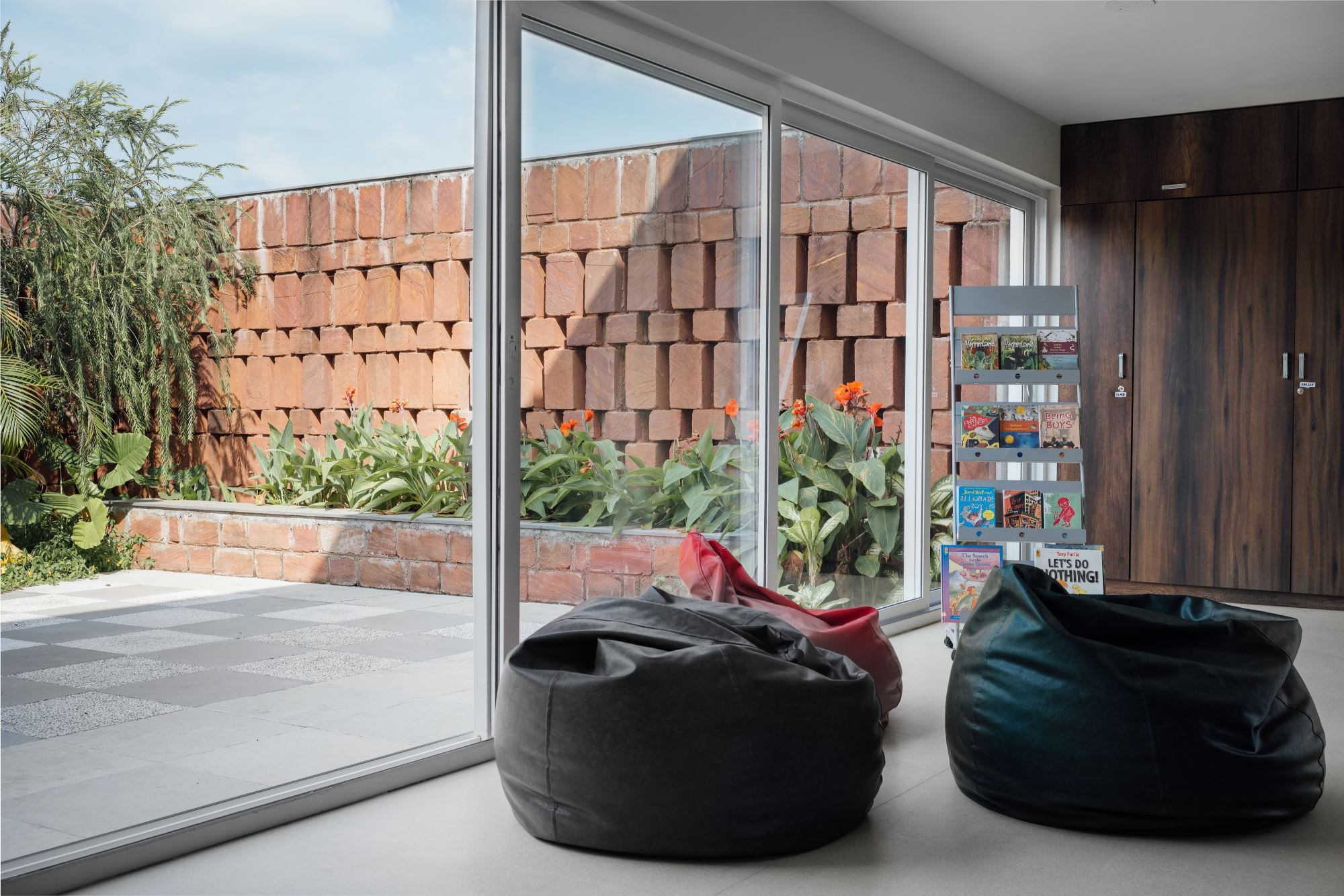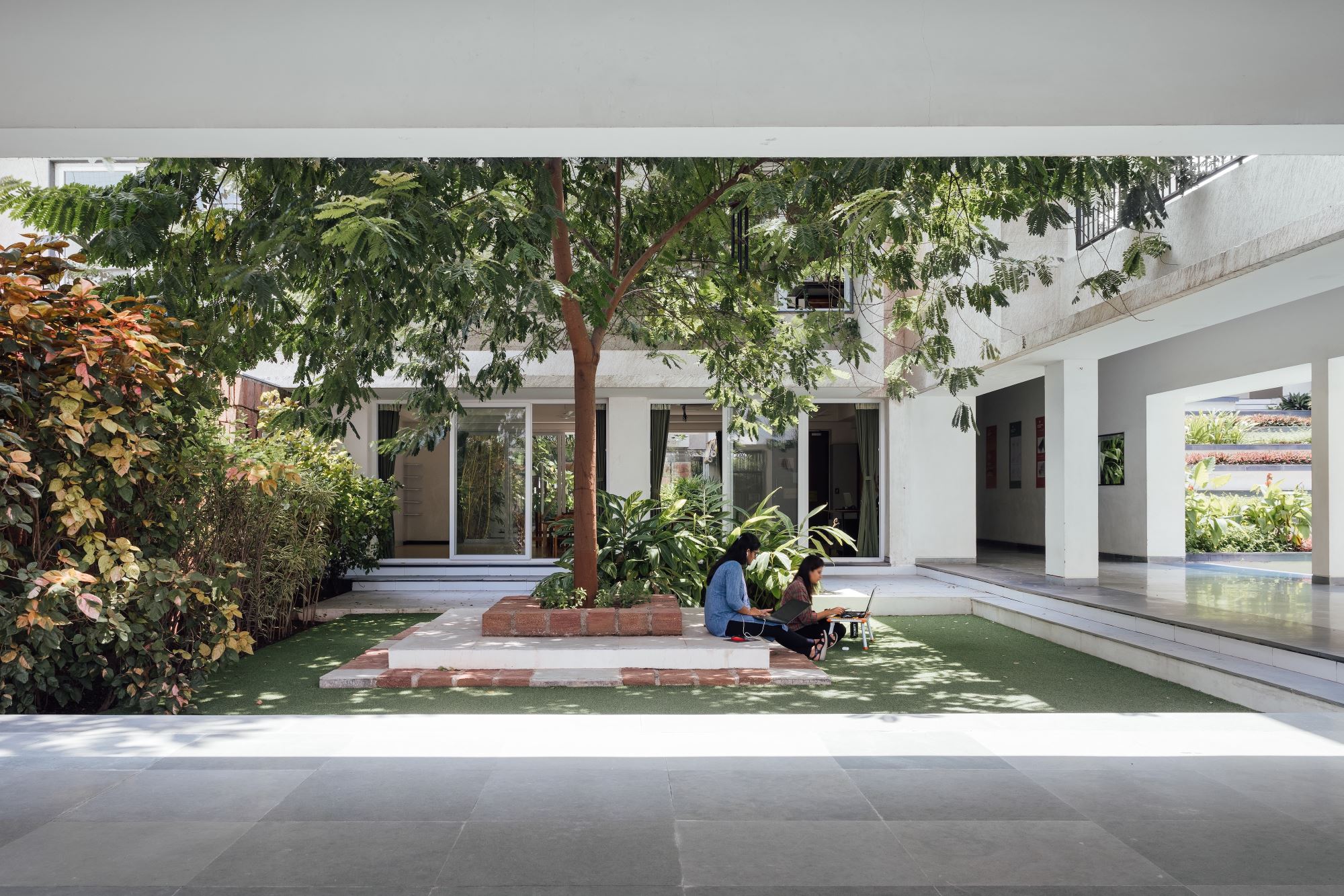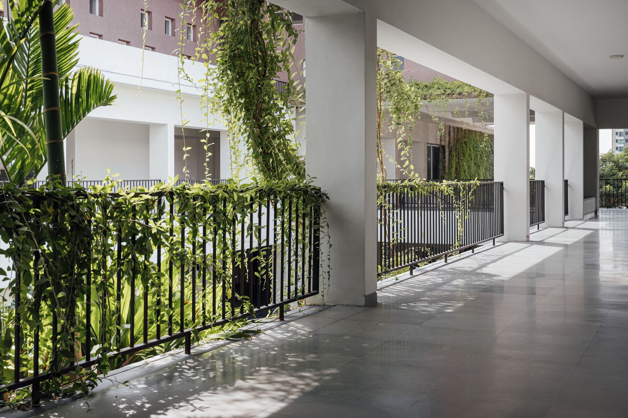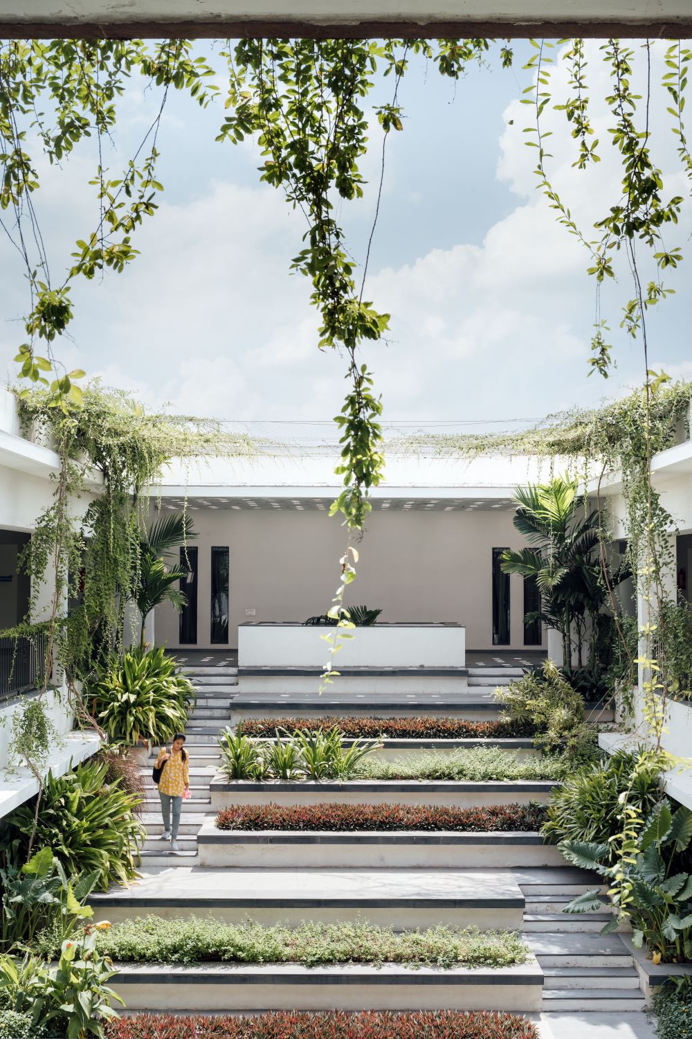 Drawing inspiration from stepped wells of Gujarat, a central courtyard ties all the spaces within each module and is replicated in all phases. This central stepped and vegetated courtyard serves for larger gatherings as a multi-purpose space and for circulation. Integrated within the courtyard amidst the green pockets, creepers and vines is a stage, that is used by children or staff to perform.