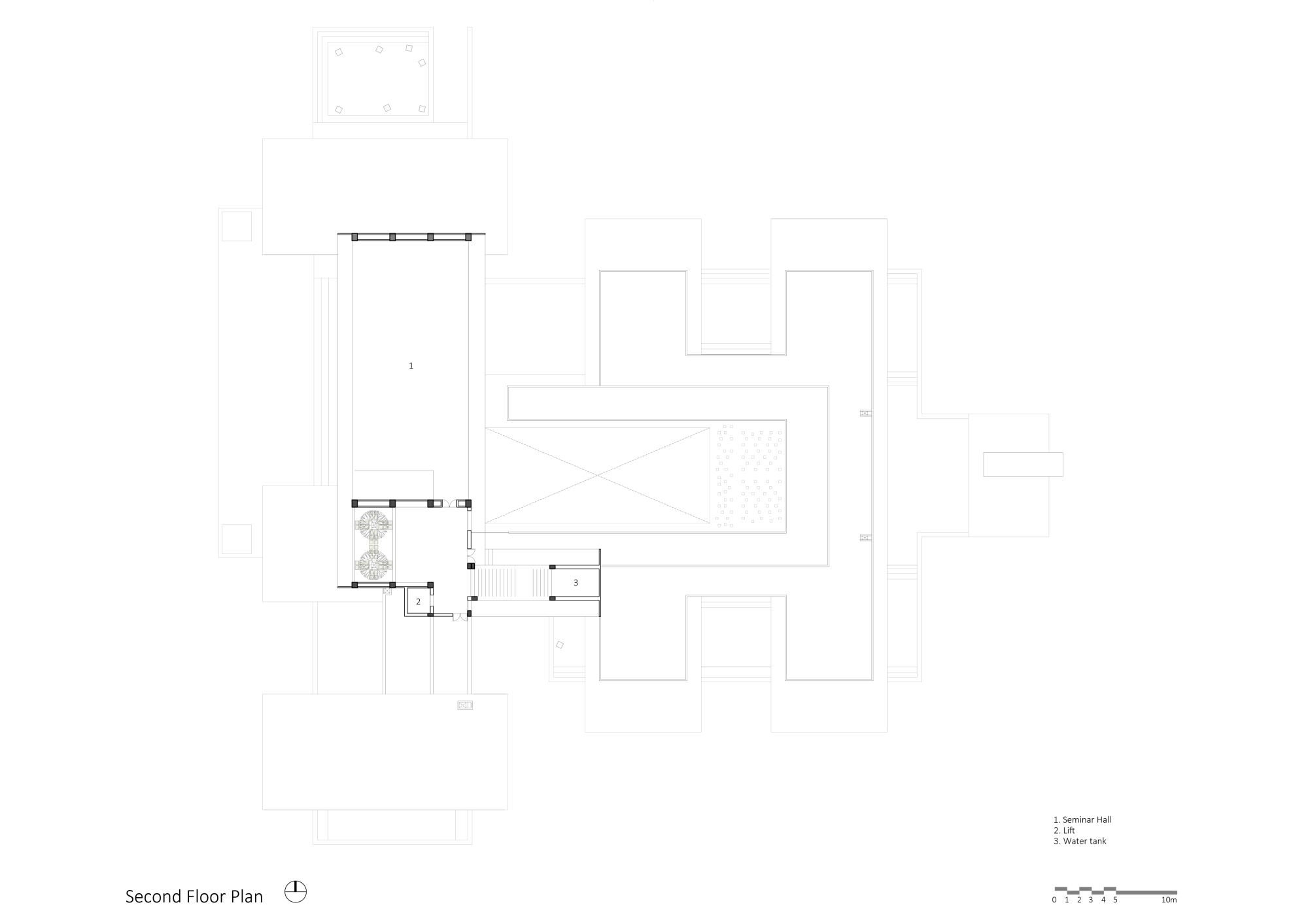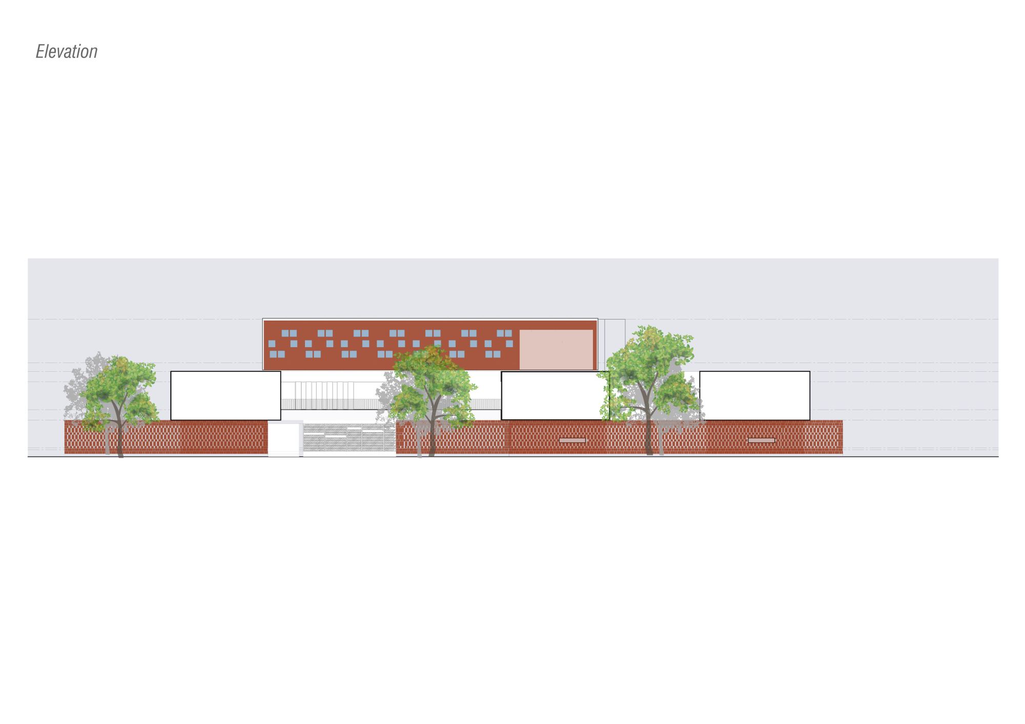 A secondary skin – Jalli in ground floor and an ambitious creeper screen in first floor, has been planned in all floors to allow natural light, shield dust and provide security. When exploring material for the façade, the criteria was for it to be locally available, have an earthy tone, reflect an institutional character and be economical. Bella, a natural hard lime stone in terracotta color, has been used to blend the built form with existing surroundings.
