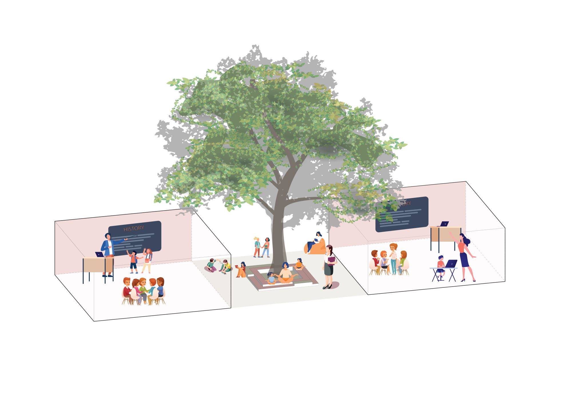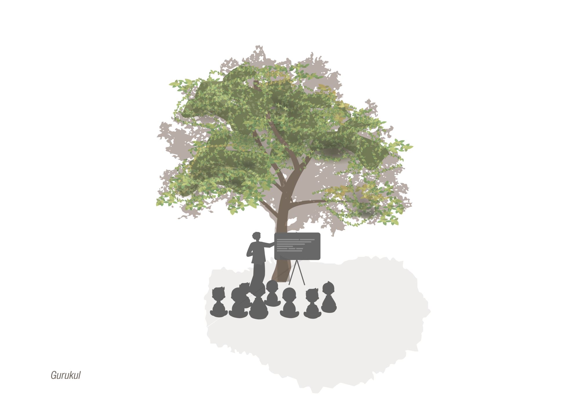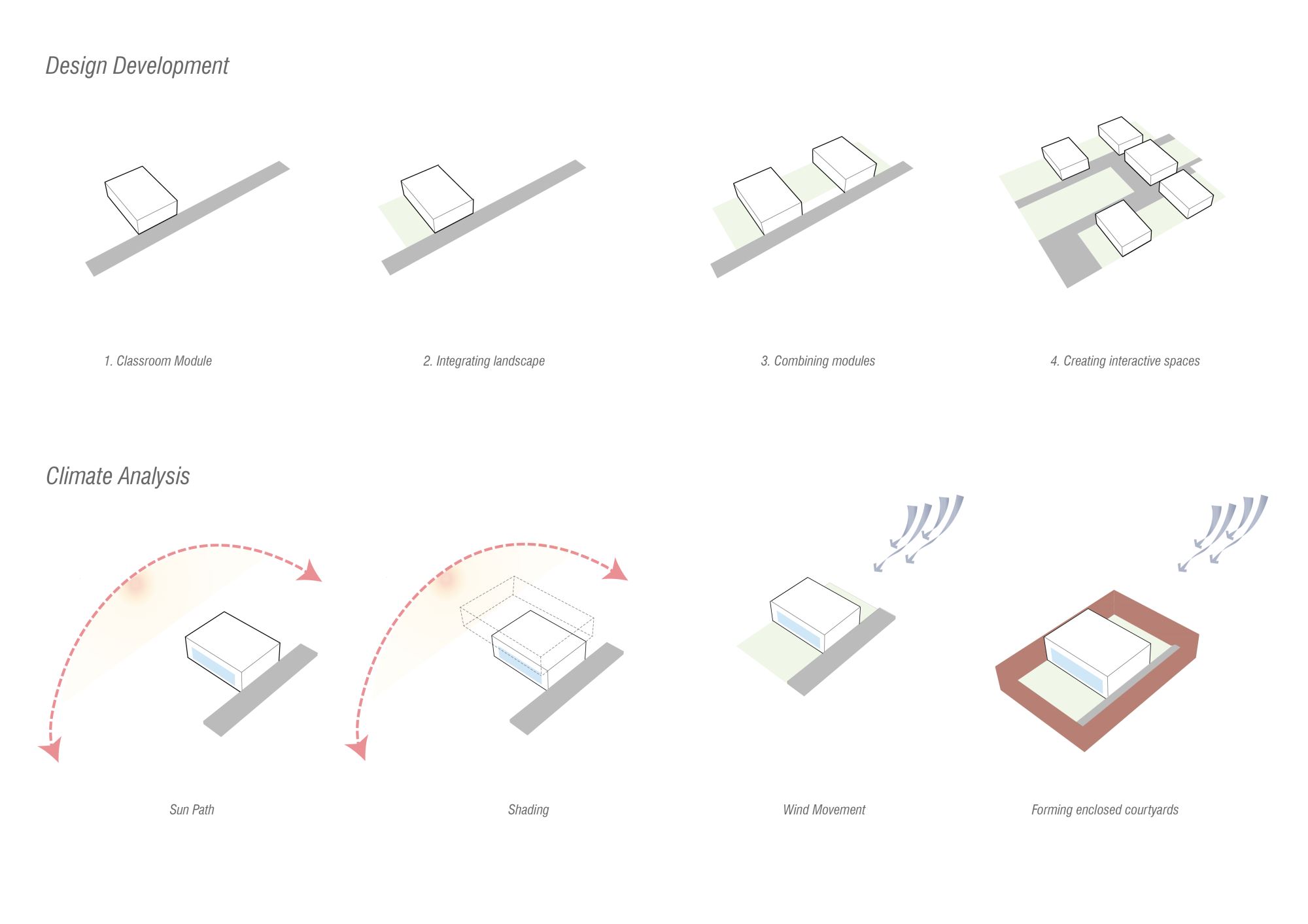 The primary intent was to find ways to learn with nature. The fundamental unit of schools are classrooms. So, the design process started in programming a single classroom module with cross ventilation, its own private garden and an open to sky jallied courtyard. This module was iterated to arrive from a part to a whole. Between two classrooms is a larger garden that is easily monitored, has a performance space and provisions for conducting classes.