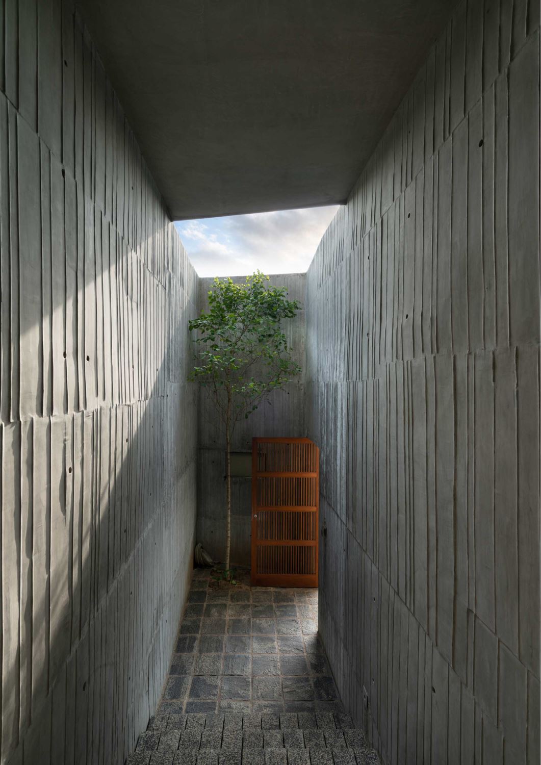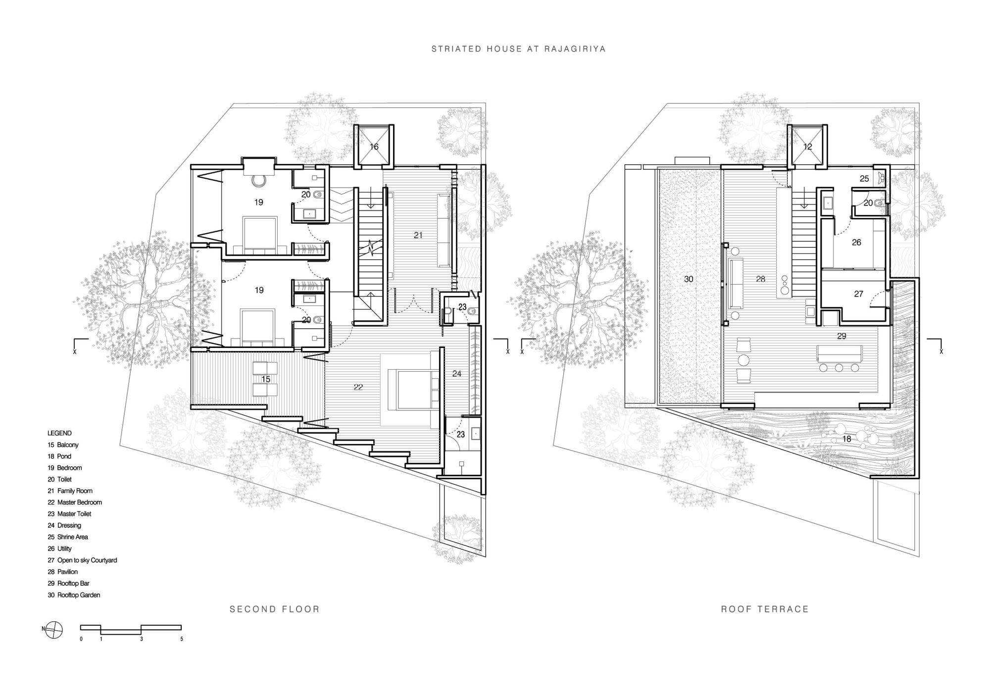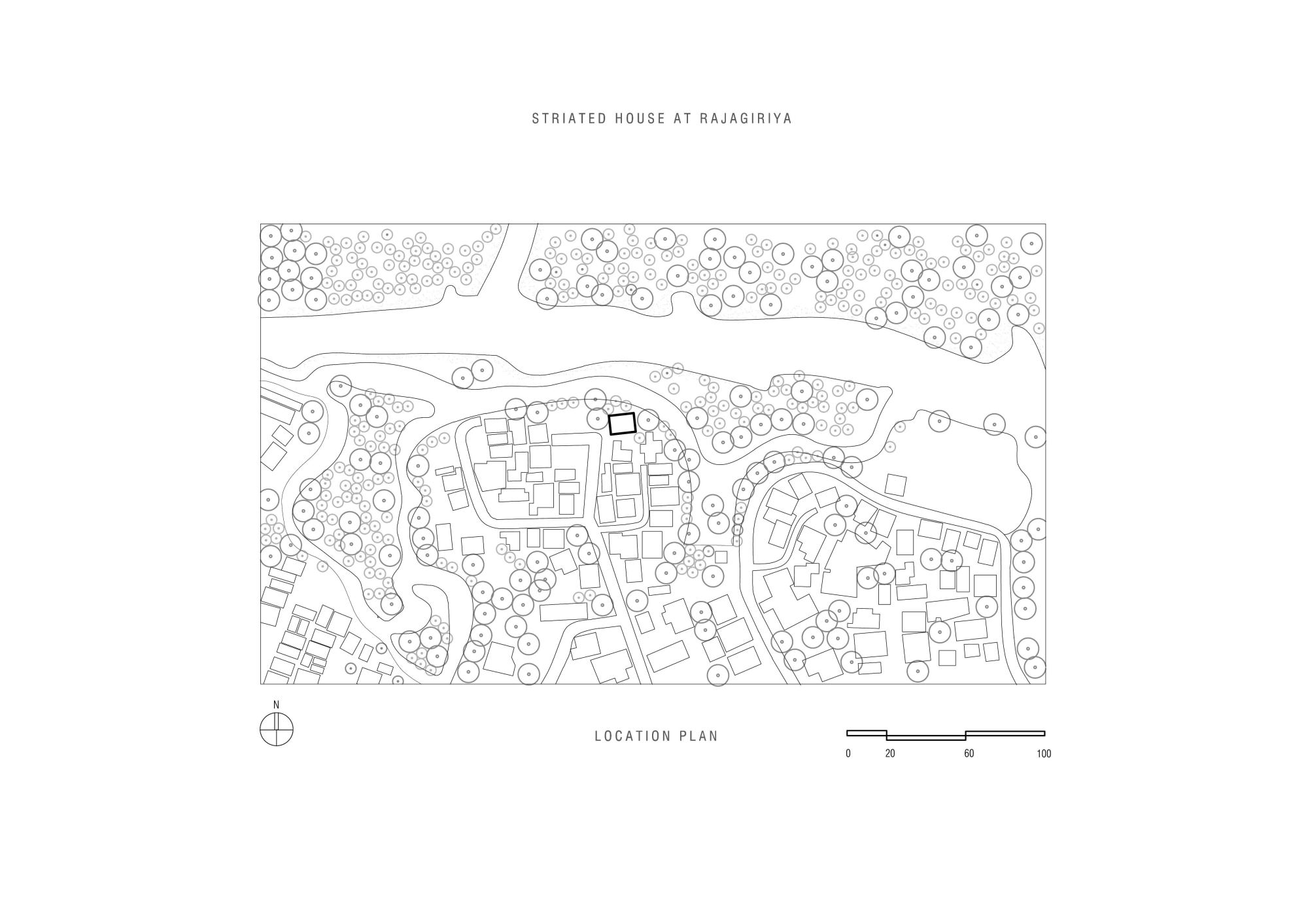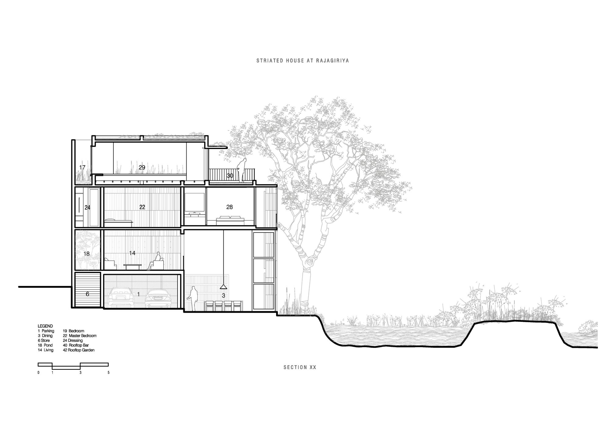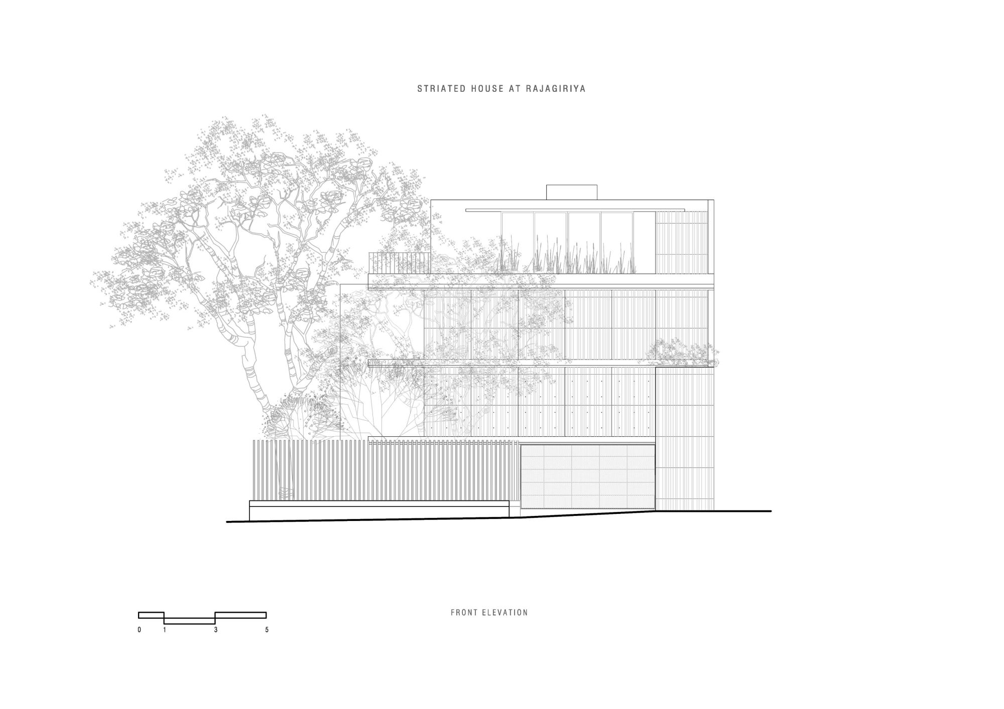Located in a fairly dense suburb of Colombo, the striated house is a family home facing a marsh, it is surrounded by taller buildings along all three sides. The windows are oriented towards and completely open up to the marsh and the north. The western facade which faces the street is stolid with fins, a facade that gives little away to a rather dense neighborhood with 3+4 floor buildings and higher building beyond. The home is built on a small footprint of 1900 sq ft. A journey from the exterior world through a narrow space, reminiscent of a calming device in the spiritual spaces, from a busy street into a more private realm. The exteriors of the walls, and light falling from above and an unexpected trees and a slender stairwell, dramatically lit, this slender space culminates at the fish pond at the upper most level. The first floor comprises the living spaces, with views, a staircase that leads down. The entire ground floor opens out.