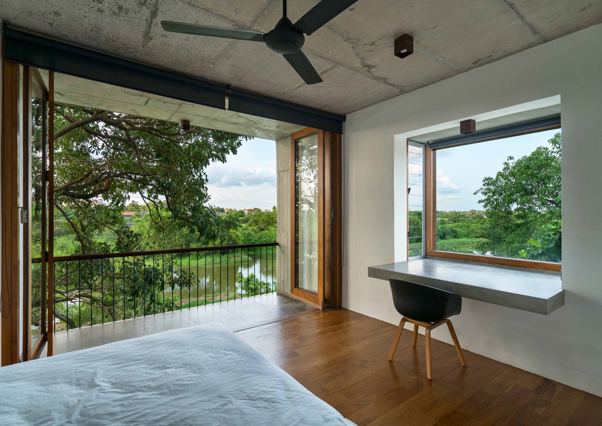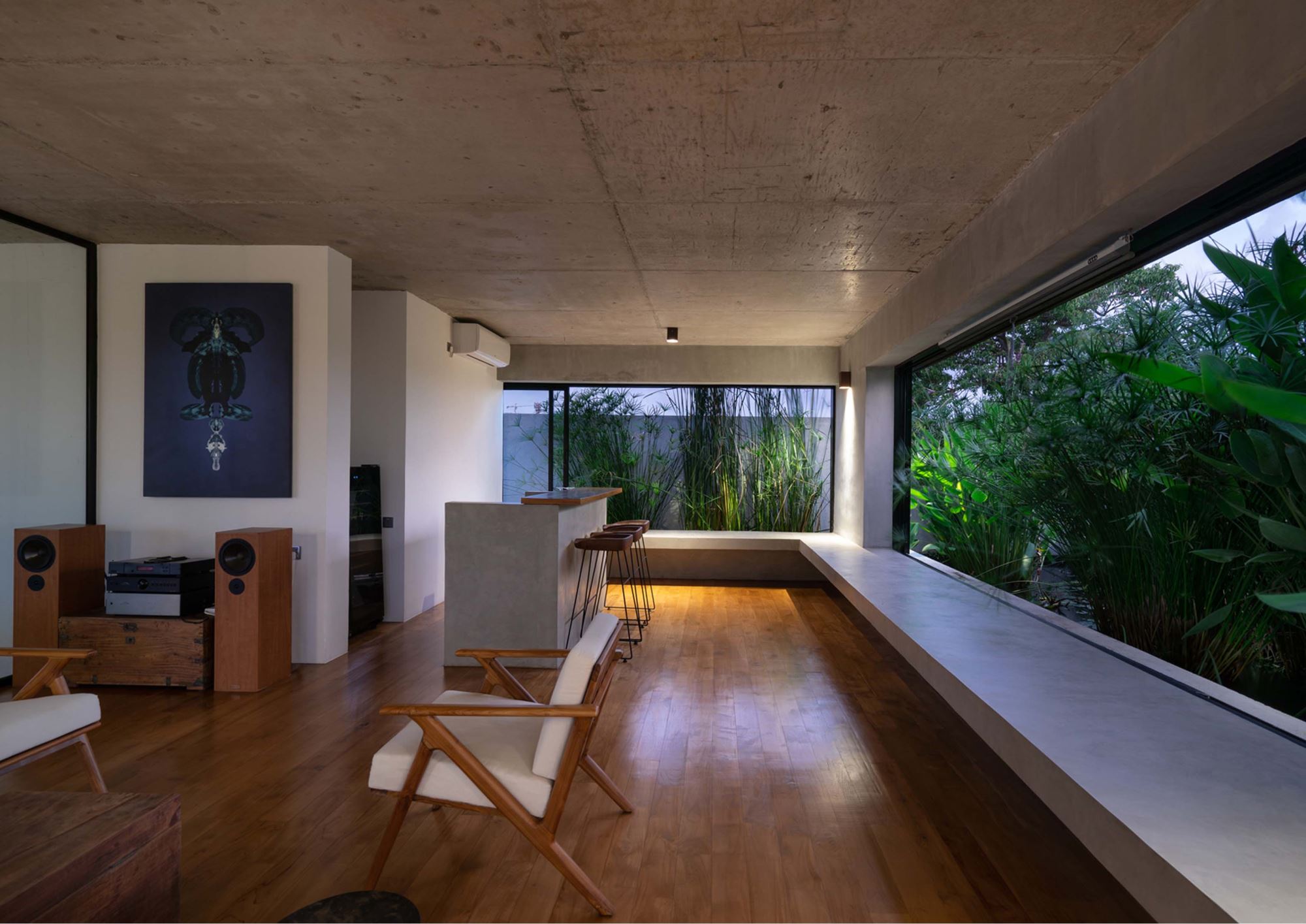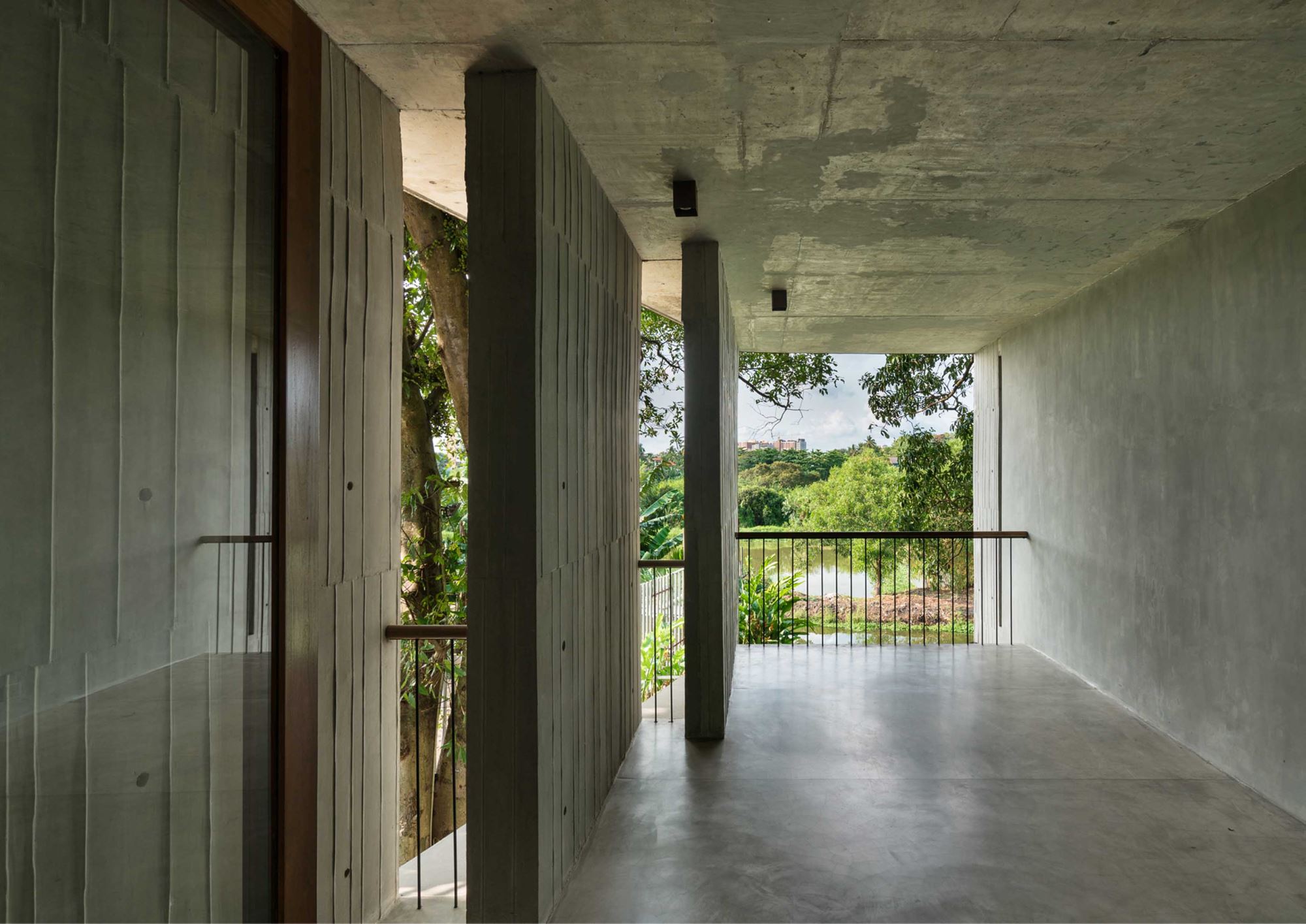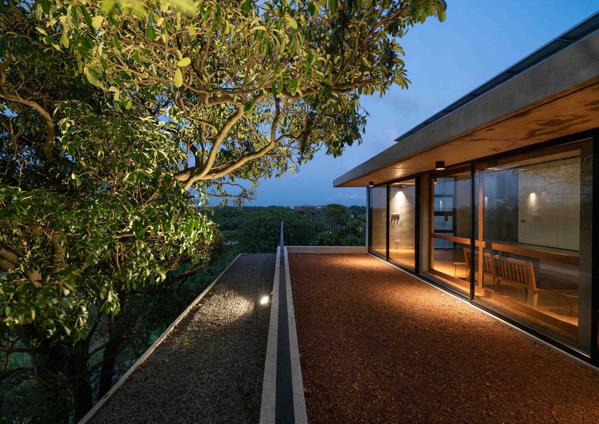 The design makes use of its sloping site creating a home which maximises the levels and views of the surrounding area. A Simple material palette, only the fin wall is made of slender concrete that steps following the site boundary. The rest of the building is composed of brick walls promoting creative use of materials in the tropics. The rooftop is an intensive green roof that is totally permeable, made out of locally available crushed late-rite aggregate borelu , a biological pond that is filled with fresh water fish and tall reeds and water lilies screens the neighboring high rises. This further regulates the storm water. The roof top further has the cooling with solar panels, ensuring that most year round does eliminates the need for ac although provision has been made. The trees and gardens become added shading devices to the home, shadow and shade being essential to tropical living. The kitchen garden too has bananas and fruits, with daily herbs like turmeric. This has been useful especially during the difficult pandemic times, when the family has been living and working from their retreat like home.