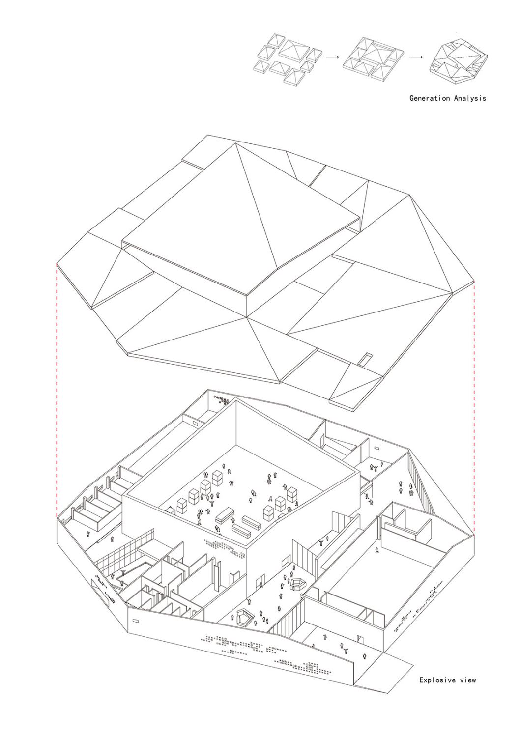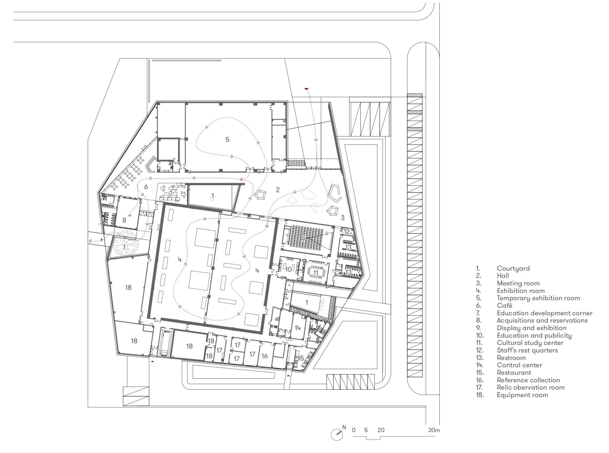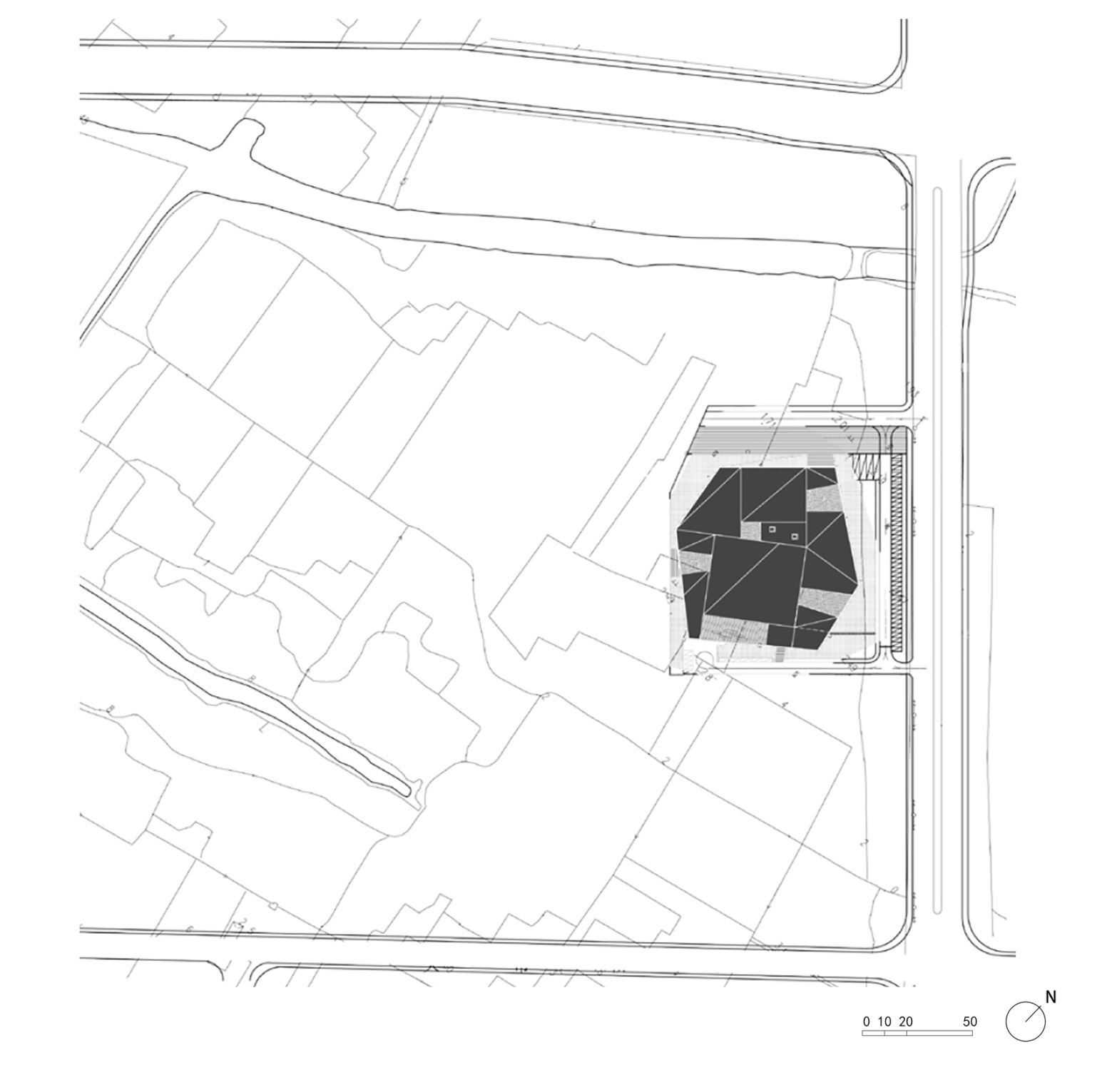 The fifth façade, which is formed of disordered geometric units, has an intertextual relationship with the “jigsaw” of fields crisscrossing the surrounding area, and the undulating, sloping roof provides a spatial experience of sheltering under the original shacks. The museum’s public spaces follow the path between the “huts,” with an entrance via a corner courtyard that creates an entry point into the original space and gives it a sense of history. The physical manipulation of the building abstracts the prototype of the settlement, leaving a considerable amount of blank space in the geometric combination process. The spatial conjugation of the real and the virtual form an image of the settlement as “house and courtyard interlaced,” which corresponds to the traditional Jiangnan lifestyle in the Jiaxing area. A viewing platform has been built at the end of the tour path. The sequence is pushed into the distance, attracting visitors to the site so as to get closer to the history and touch past times.