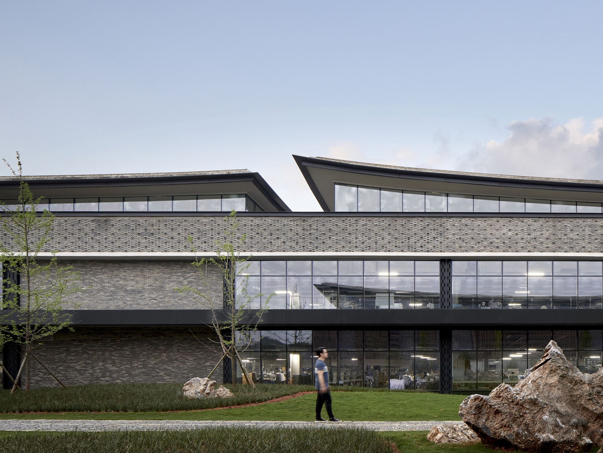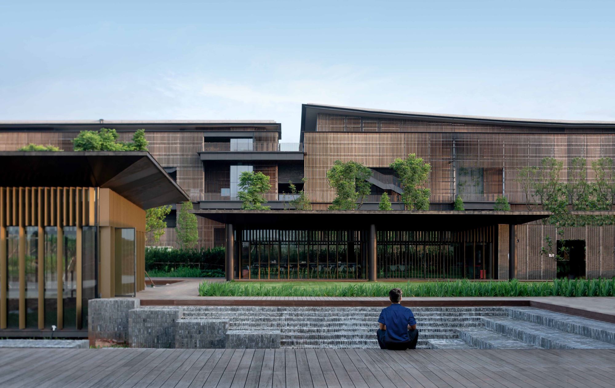 The highest point of Integral is only 22 meters in elevation. The design intentionally extended the main building horizontally instead of vertically, seamlessly integrating the large production workshop and craft center with the natural environment. In turn, this makes the site’s greenery the main focus, with the buildings playing a supporting role in the overall aesthetic. Elements of the local architectural language and culture appear everywhere, with distinctive blue bricks and bamboo panels used extensively in the buildings’ exteriors, including a large, semi-transparent bamboo curtain placed on the façade of the large craft center’s wall to soften and break up the building’s massing.