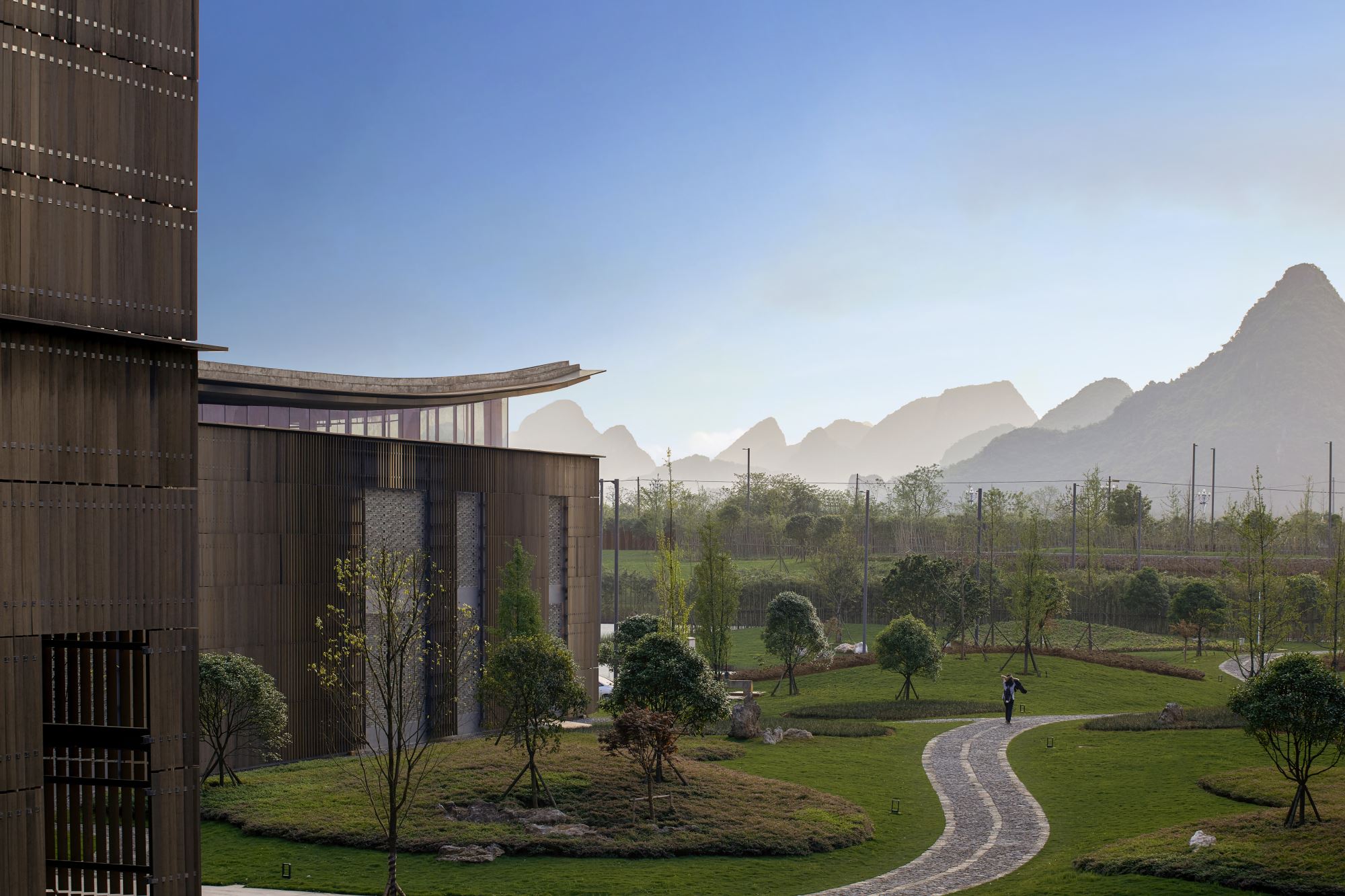 The design of Integral began with studies of the site’s topography and geology. The history and culture of Guilin were also respected, as were the area’s unique landscape features and contexts – reflection, layering, colors, and textures. All these elements are tactfully revealed in the building’s massing and envelope design. Next, the design team began restoring the original wetland landscape. Even before ground was broken, this over-exploited site was intentionally left alone for a year to allow nature to begin restoring itself. When new plant life sprouted and flocks of egrets arrived, it marked the true beginning of the project.