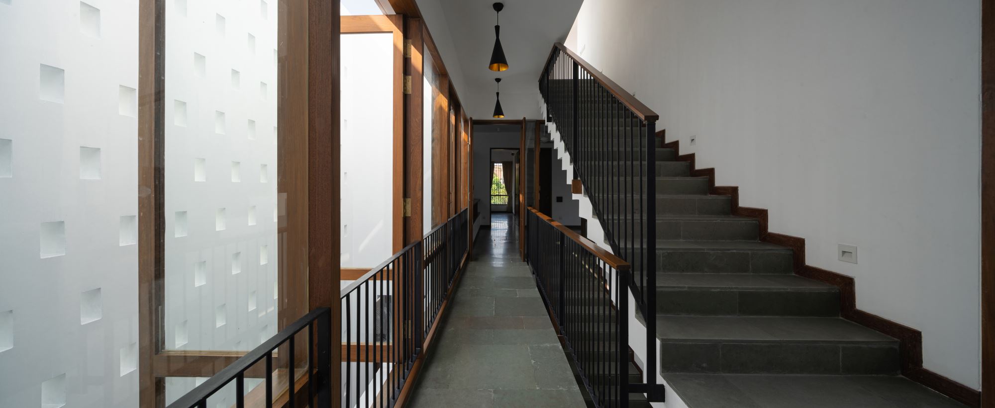 Strips of lands were sacrificed on both sides to widen both the internal path and the external road on the east – a contribution to the neighborhood was made. In terms of form, the two-storied lower volume on the lawn is connected with the three-storied volume through the lightwell and staircase. The lightwell, which is also the formal entry, with its perforated wall, water body, and small wooden bridge, is the hub of the house itself and is designed to be a spatial multitasker. It was an important consideration in the design that the mass should not overpower the neighbors’ houses in scale, and it works as an aesthetic infill of humble nature.