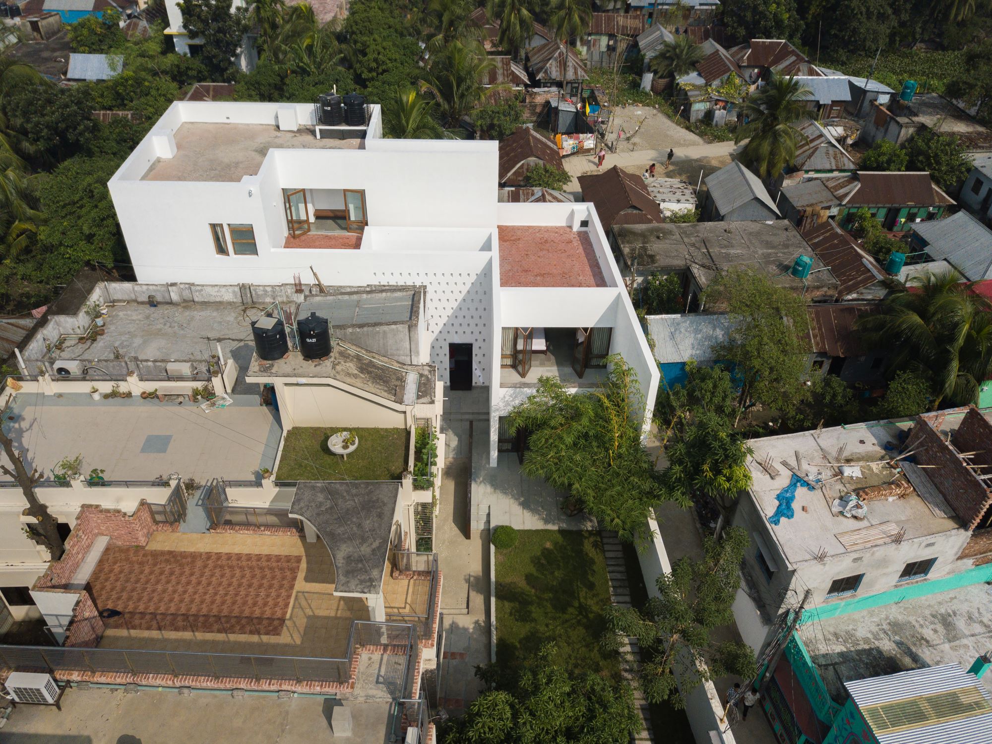 The zoning of spaces was derived from the anticipated lifestyle of the inhabitants during their stay. Almost every other week, the mother will come over from Dhaka to stay for a few days to spend time with members of the greater family from the neighboring houses and old acquaintances. Her room is at the ground level, with an adjacent space for casual meetings. Visitors will often stay for lunch or dinner. The dining room, hence, is in the closest proximity. When the brothers are visiting, people from the locality will come over, often in groups, to meet them. Mother will require her privacy. Therefore, the living room is set apart by inserting it into the entry court and the stair. The screened entry court also ensures visual privacy from the adjacent buildings while bringing in light and air. The face of this double-height space is a wall with perforations – its geometry is reminiscent of the ornamental pattern of a hand-woven cotton saree. This wall is like the cover page of the house, the giver of light and air, the center that holds the spaces together — it is the tribute to the mother.