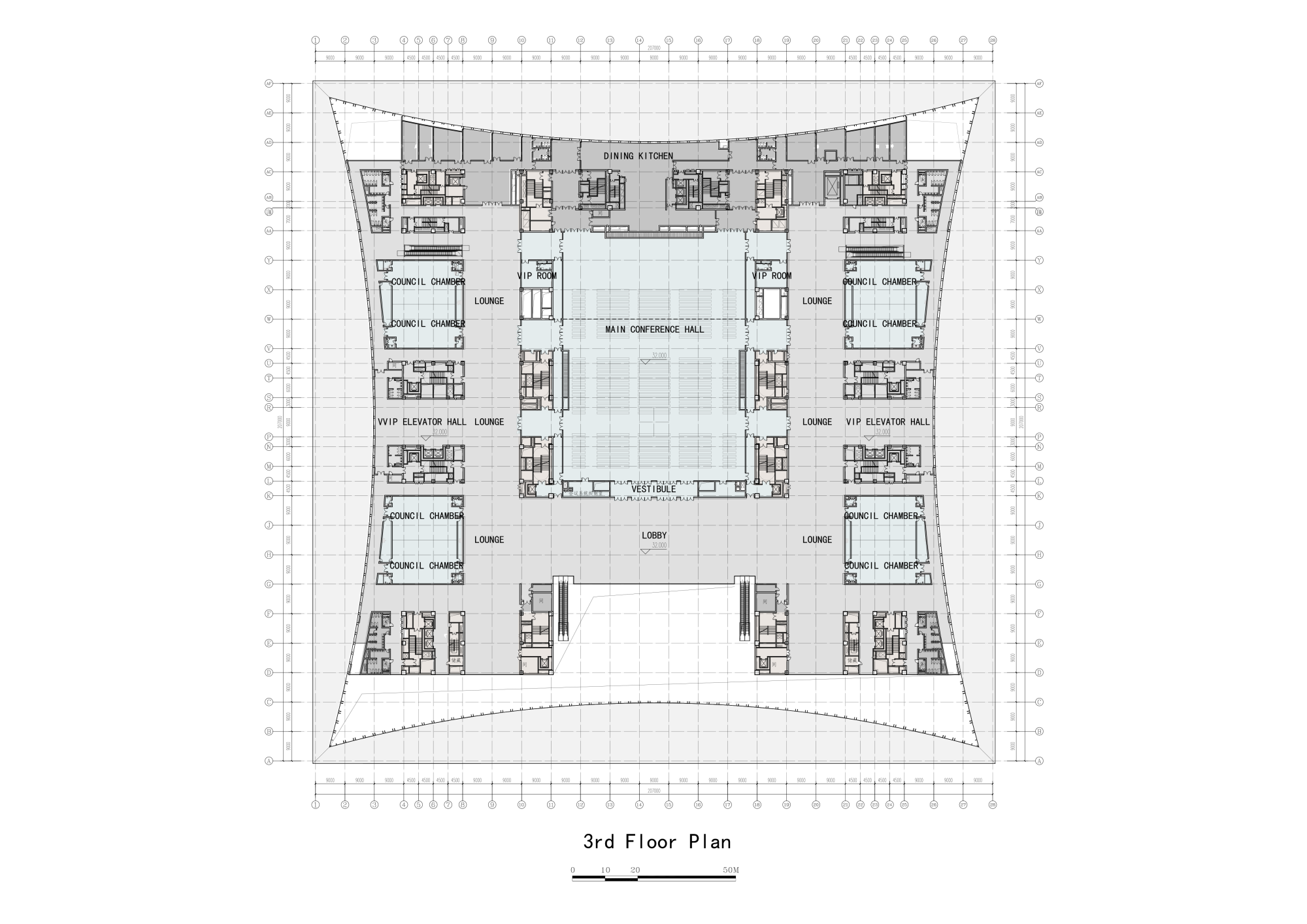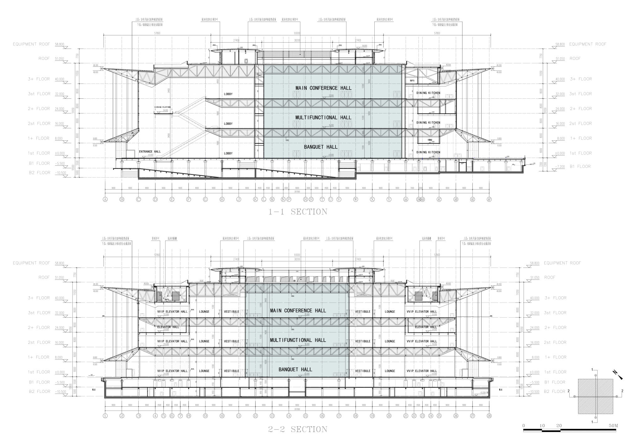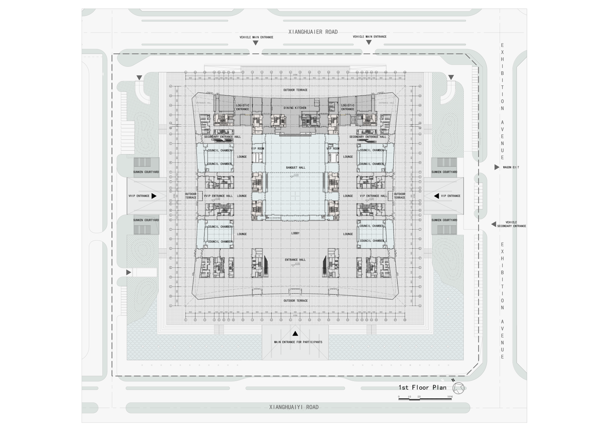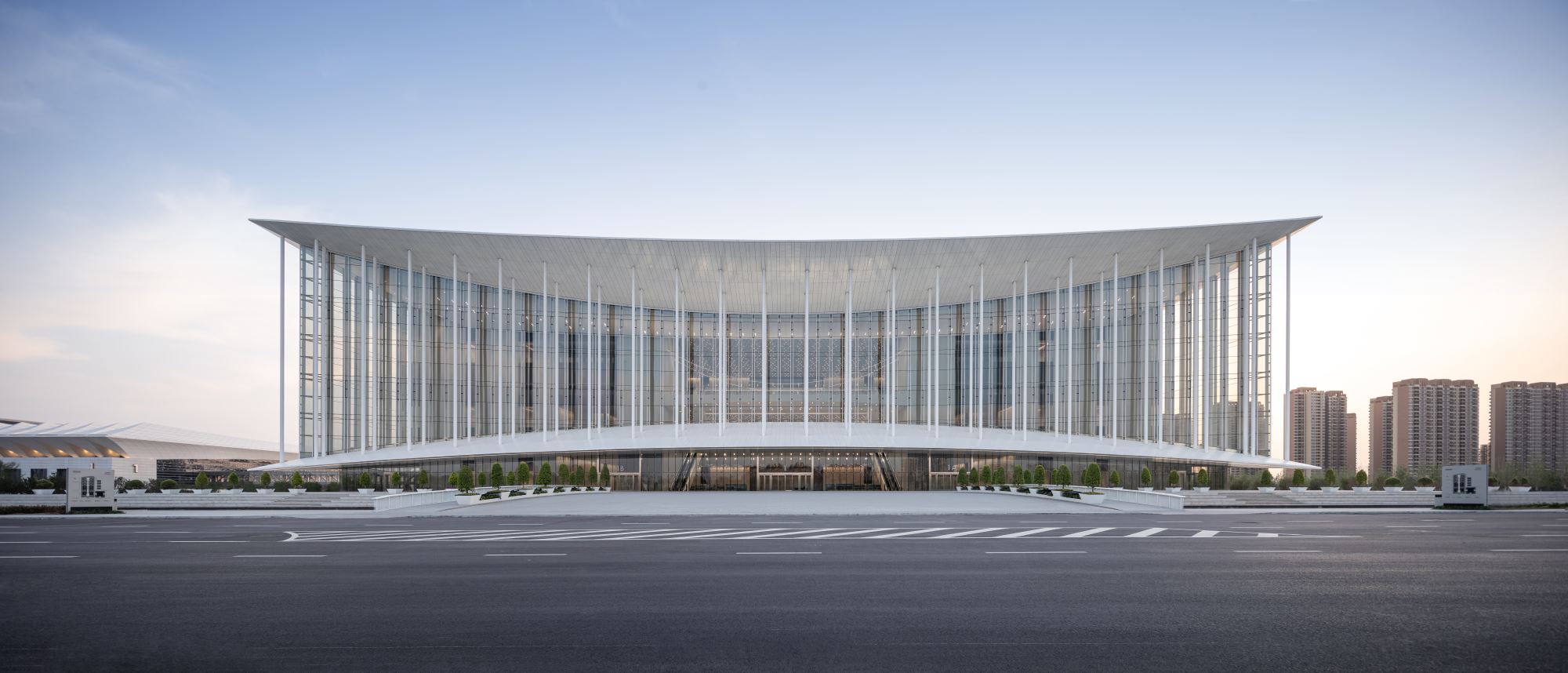 The project has a total construction area of 207,112 square meters and a height of 51.05 meters. The three floors above ground (partially equipped with a mezzanine) account for 128,369 square meters and the two floors that are partially underground account for 78,743 square meters. The building offers conference space, banqueting space, and multifunctional facilities. These three main programs stack up in three levels above ground, involving a banquet hall on the first floor with a height of 16 meters, a large multifunctional hall on the second floor with a height of 16 meters, and a main conference hall on the third floor with a height of 18.45 meters.