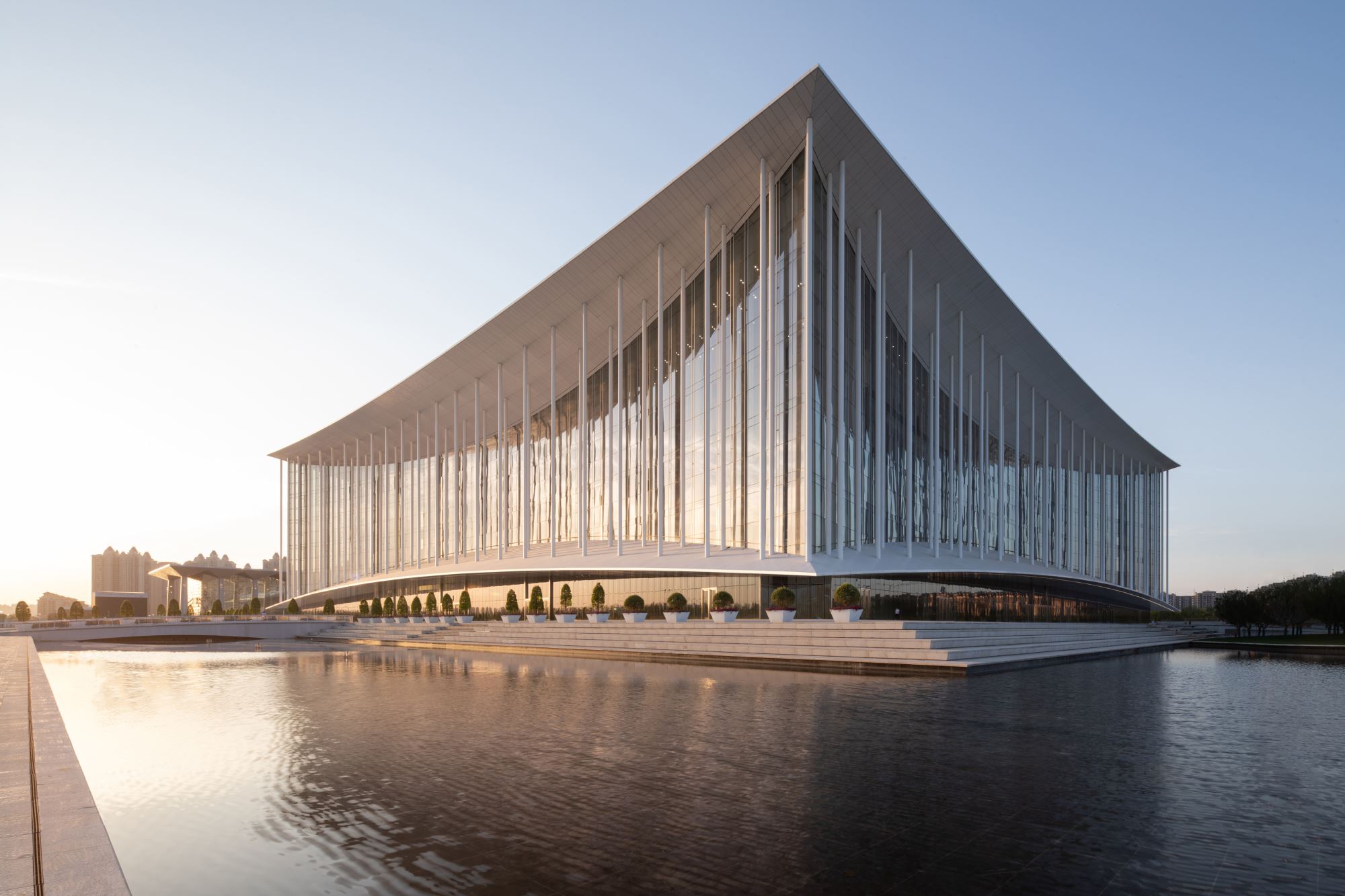The design attempts to capture the essence of Chinese classical architecture. The conference center as a whole has a square and symmetrical layout, with landscape water and sunken courtyards arranged symmetrically to each side of the south, east, and west axes. In addition, the 200-meter-long side building volume is also symmetrical and unified, with four facades. The lower crescent-formed cornices are cantilevered below the suspended column system, and the transparent glazed curtain walls surround the first-floor level on all sides above the podium. These form a spacious shadowed entrance space, creating a picture in which the building appears to float. When people reach the main entrance, located on the central axis, through the bridge above the landscape water, they experience a sequential space full of a sense of ritual. Moreover, the composition of the ascending square base, the upper and lower crescent cornices with stretching contours, and the rational and regular columns was guided by a balanced and harmonious sense of proportion, which reflects the inheritance and contemporary expression of Chinese classical architecture.