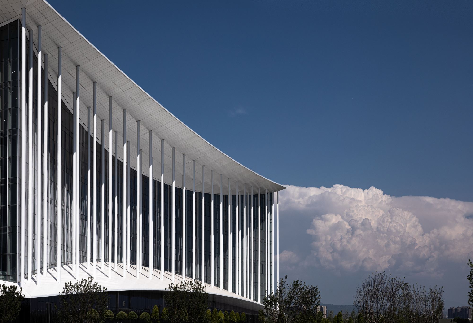 The design of the facade of the Xi'an Silk Road Conference Center applies an abstract and straightforward strategy for inheriting and translating traditional Chinese architecture. Positioned in front of a high, transparent concave retreating curved glazed curtain wall, the upper and lower parts of the longitudinally symmetrical crescent-formed cornices are linked by 24 groups of suspended slender steel columns. They form an iconic image that is at the same time modern and classic, grand and refined, and solemn and elegant.