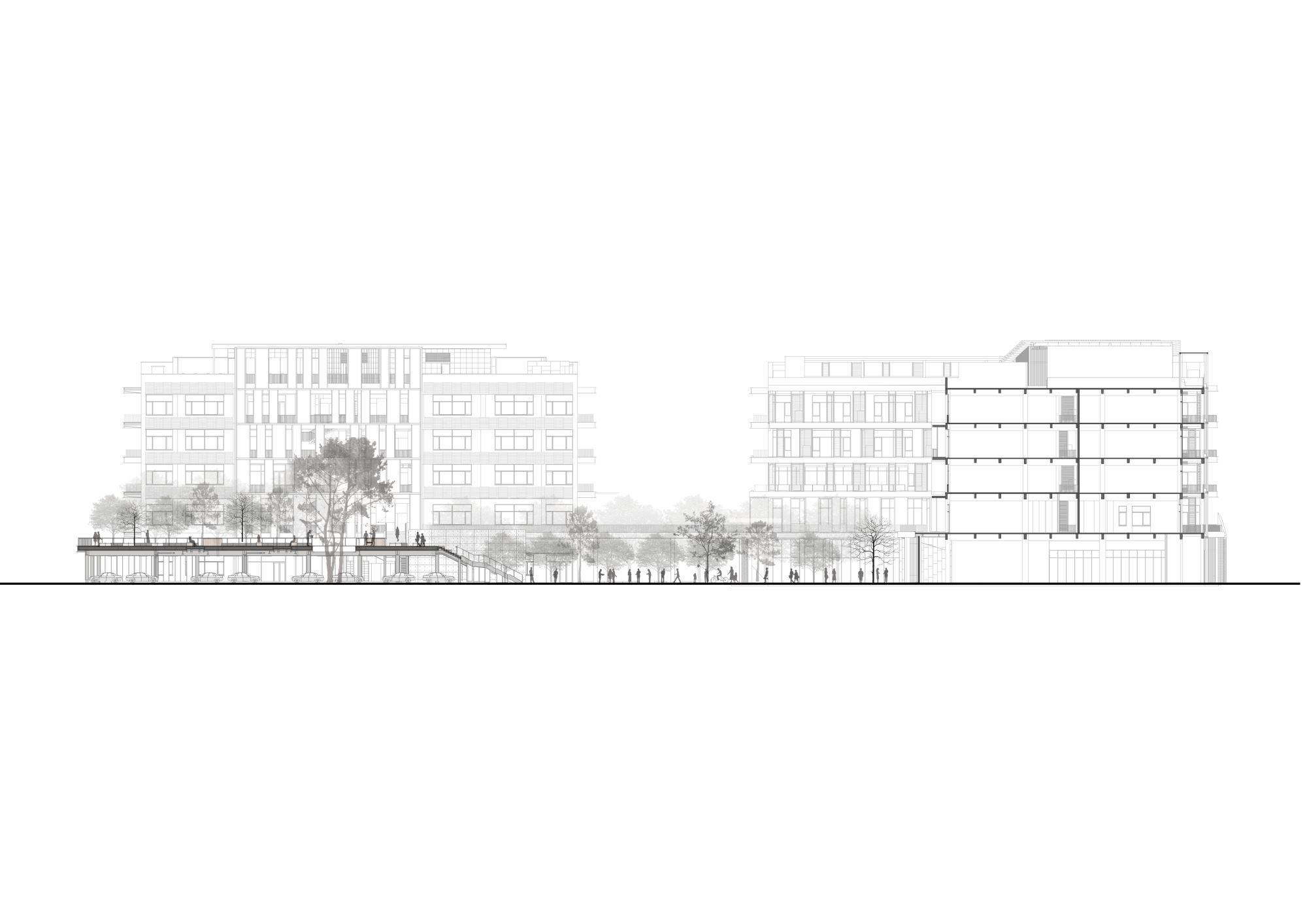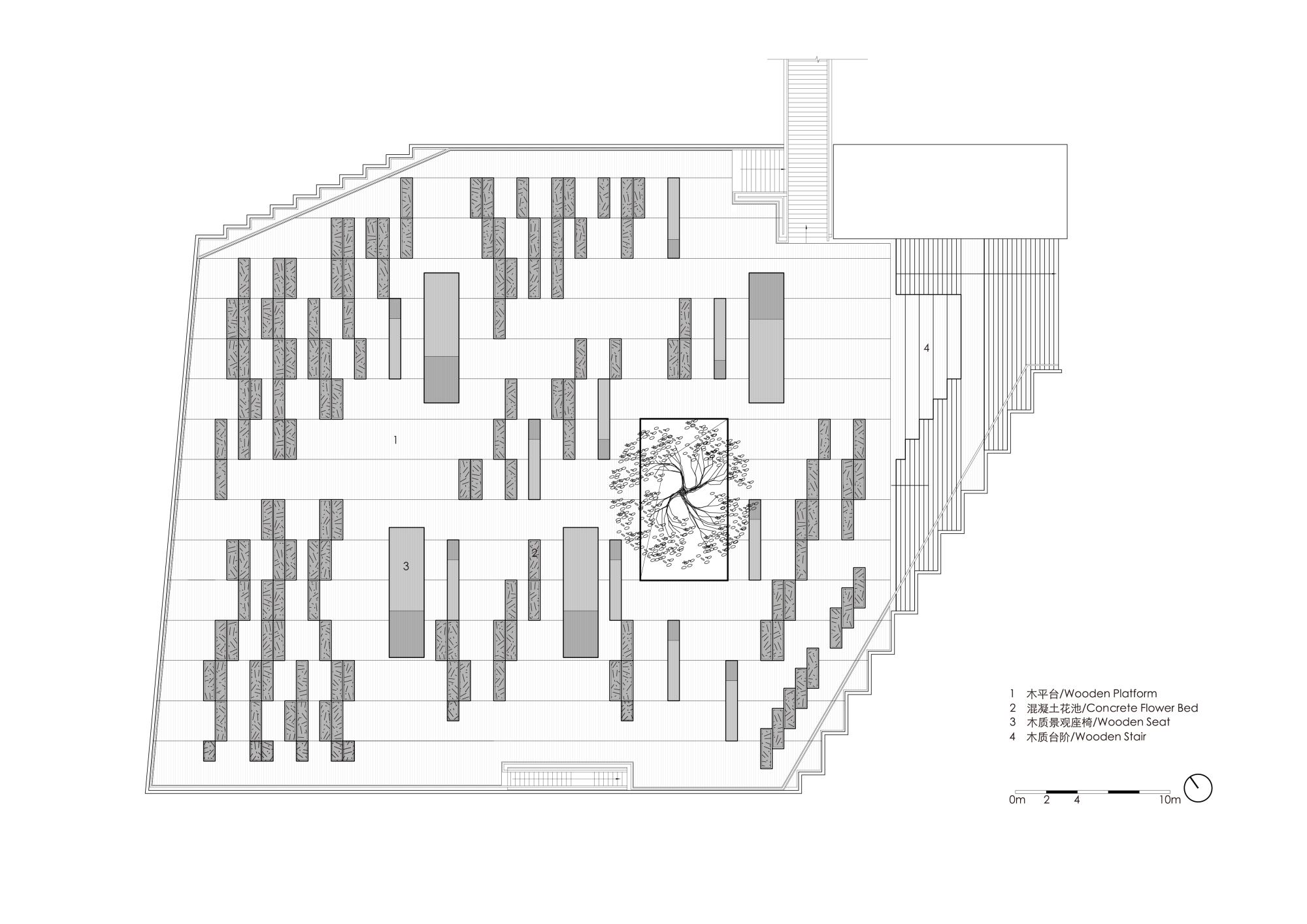 In the original site layout, there was an outdoor parking lot in the west, next to the courtyard. In order to meet the demand for parking and to improve the spatial quality of the courtyard, a large landscaped terrace was created that covers the parking lot. Connected by the steps, this large terrace becomes an extension of the courtyard through which the courtyard establishes a public space system on different levels. The steps can also serve as seats for the audience when outdoor activities are held in the courtyard.
