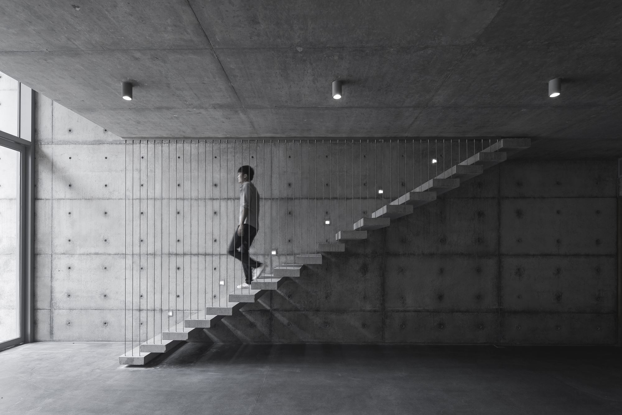 The cantilevered staircase and the hanging floor in the building make it light and delicate. At the same time, the two entrances on different levels of the building create a closer connection among the terrace, the interior space, and the courtyard.